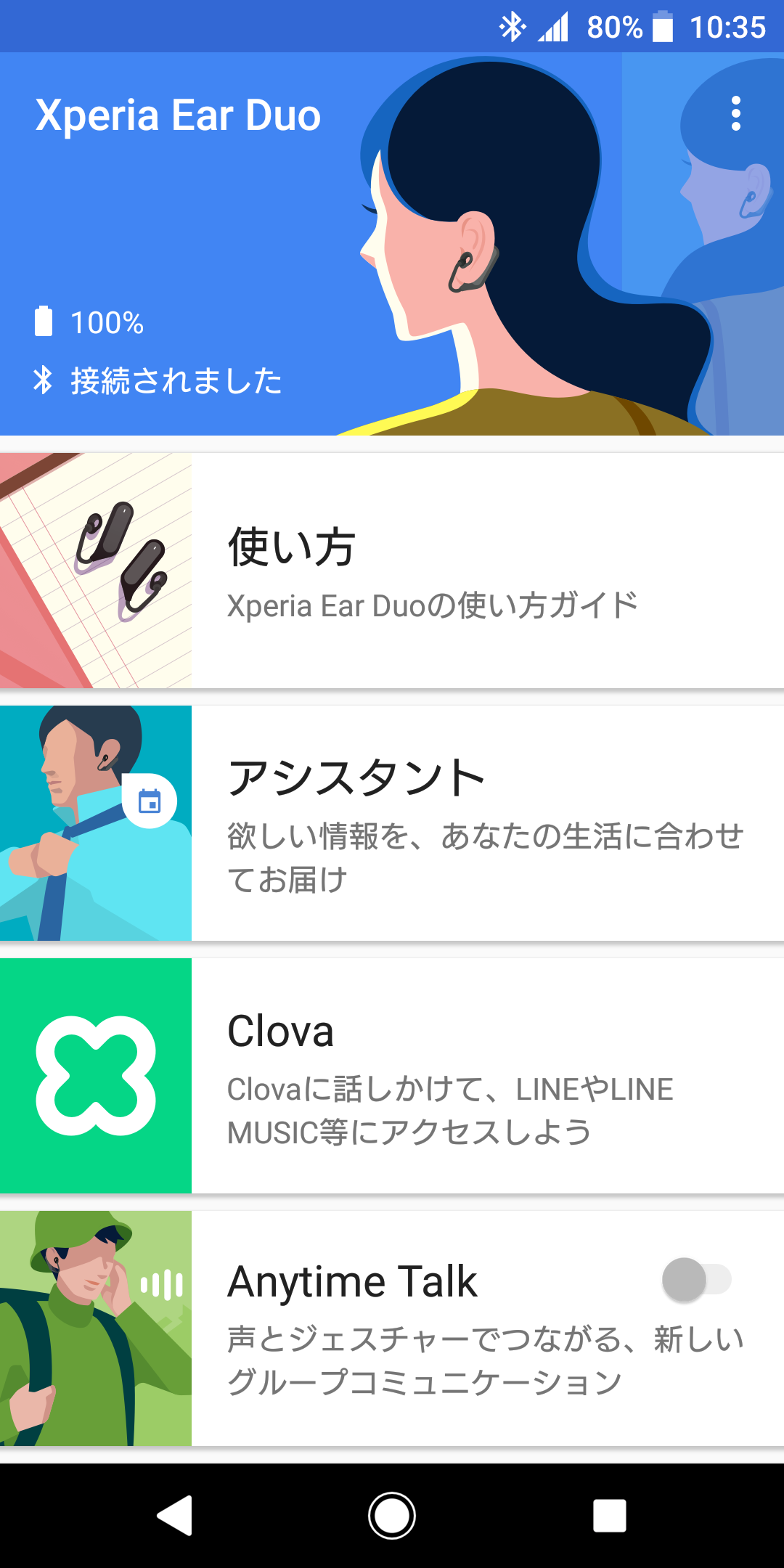 LINEの「Clova」とは開発段階から密接な連携が図られており、Xperia Ear Duoだけで、スマートスピーカー「Clova WAVE」と同様の機能が利用できる仕組み。たとえば「LINE送って」と話しかけて、事前に設定した友達にメッセージを送ったり、今日の天気を聞いたり、最新ニュースを聞いたりもできる。