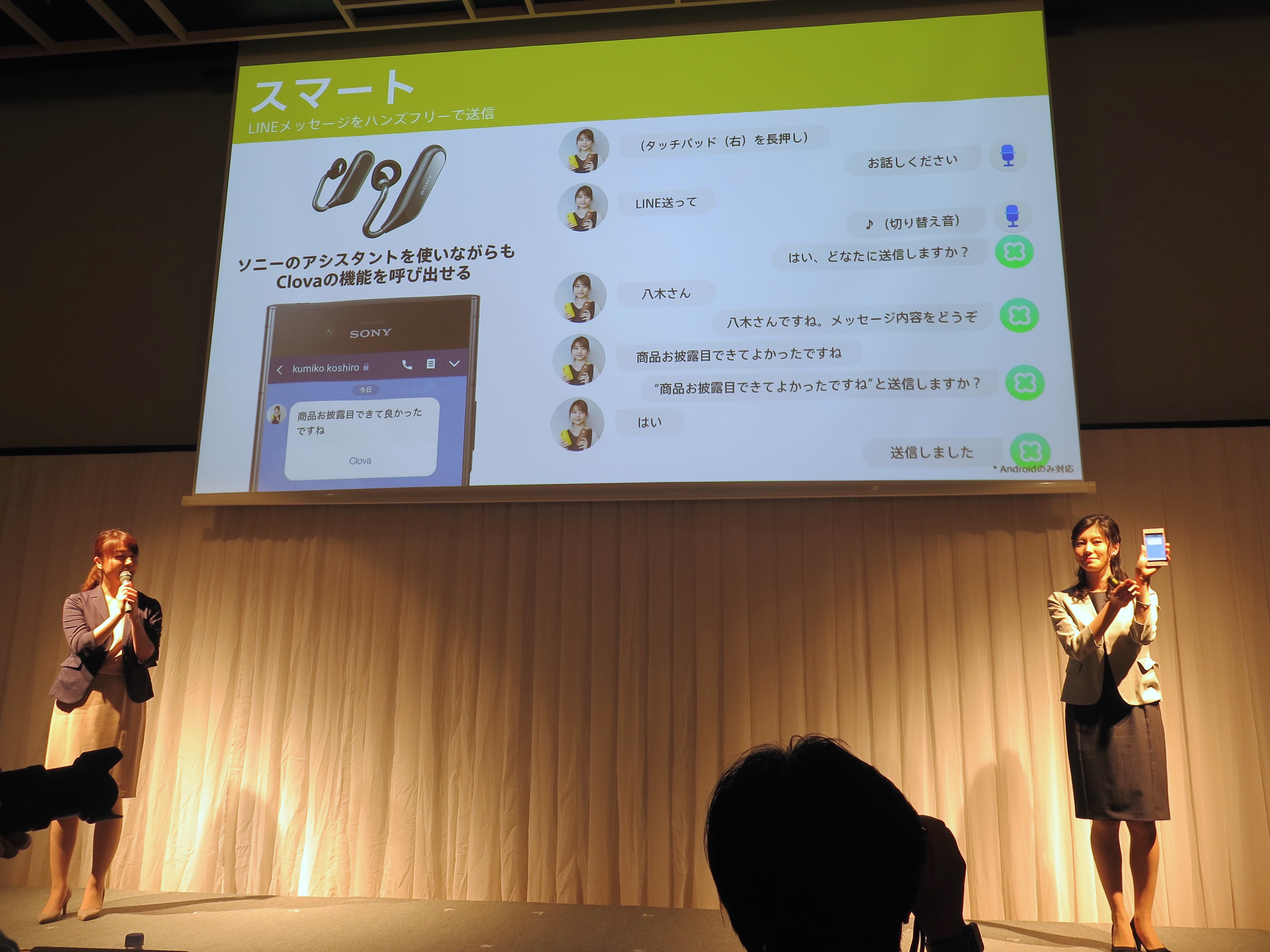 ▲LINEのClova担当者(左)も登壇し、LINEのメッセージを送信するデモも披露された