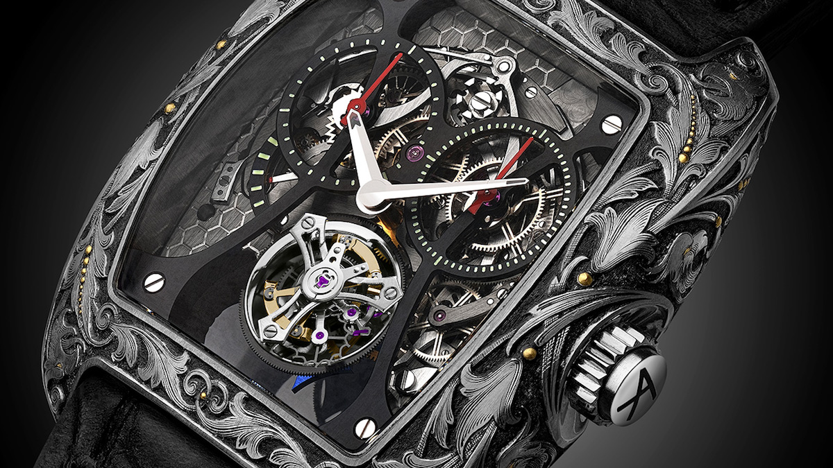 高い技術を要する時計構造・トゥールビヨン。特徴は高い精度と複雑な機構。フランス語で “渦” を意味するだけあってその構造は奥深く、見ているだけで惹き込まれるような魅力があります。この度お目見えしたのは64チタンを彫金したトゥールビヨン。限定世界1本のラグジュアリーモデルです。