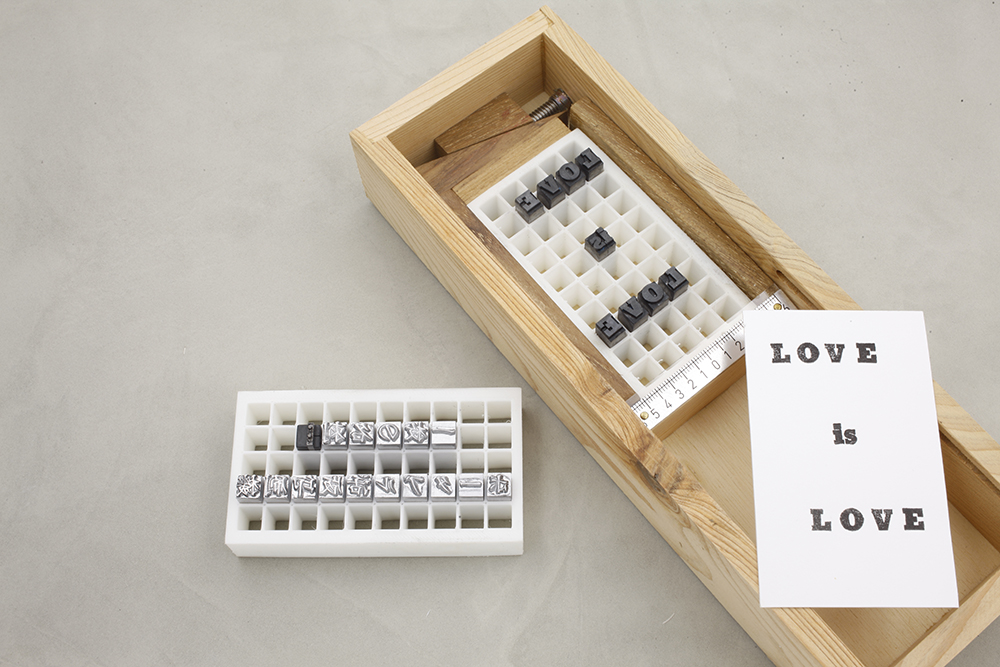 デジタル化が進み、今は激減した活版印刷ですが、この「ポータブル活版印刷機:一枚の名刺」を使えば、自分で組版からインキによる印刷までできちゃうんです。今回、樹脂製アルファベット活字と入門用ステッキ(組版用の枠)が付くので活字を買いに行けない方でもすぐに体験できます。もちろん別途、鉛の活字を自分で購入してきて作ることも。