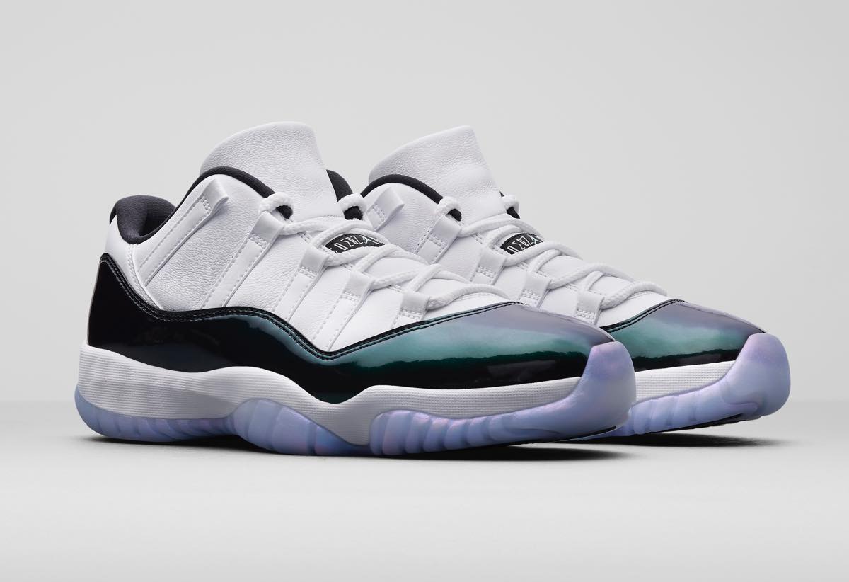 「エア ジョーダン 11 ロー イリディセント」は、「エアジョーダン 11 ロー」にエメラルドのパテントレザーと虹色のアウトソールを用いたオシャレなモデルです。
