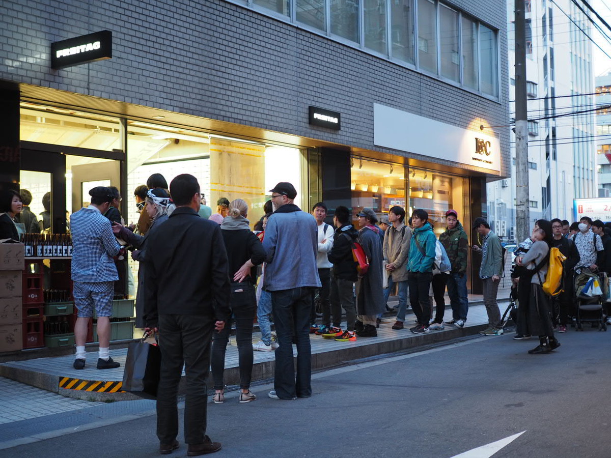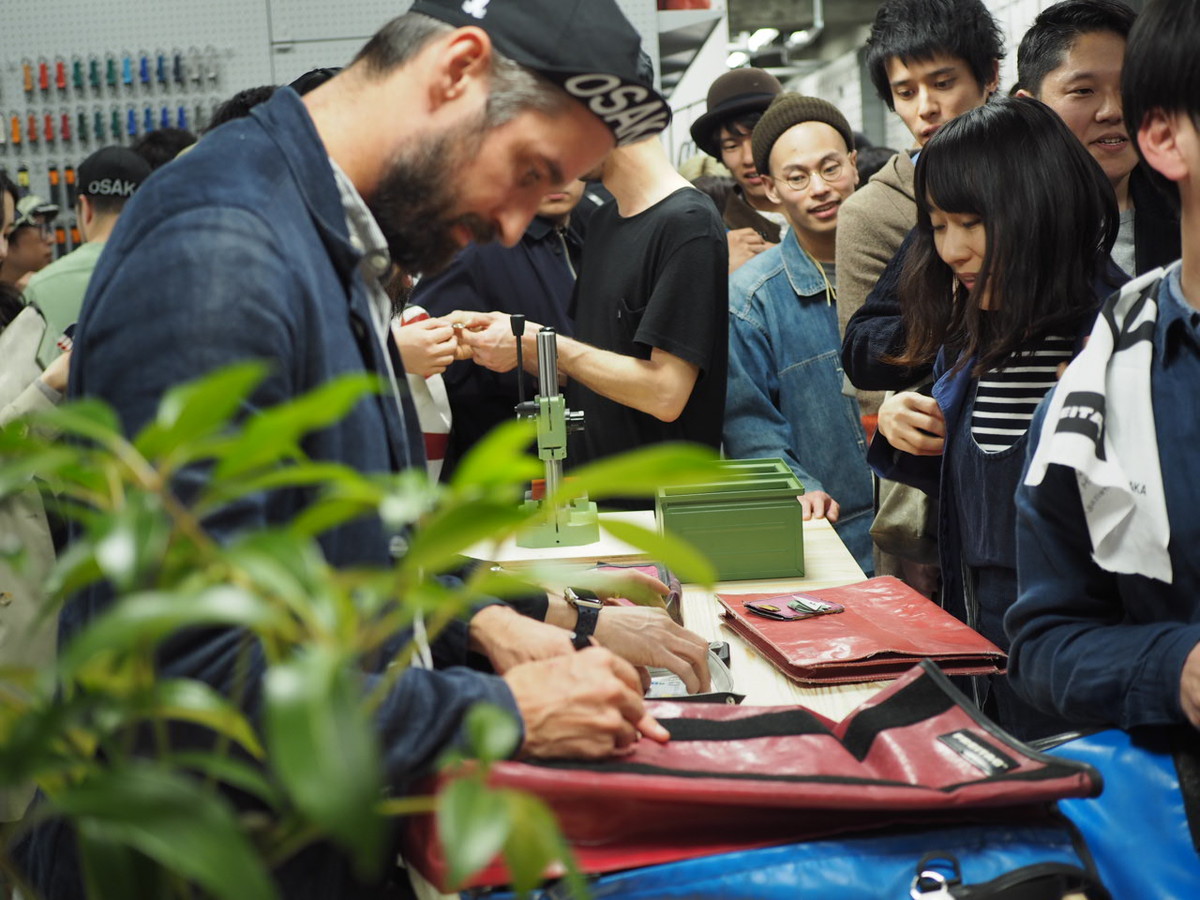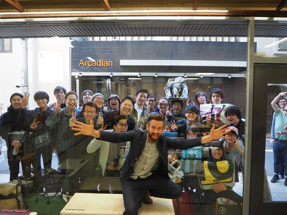 日本で3店舗目となるフライターグ ストア大阪のオープンに伴い、フライターグ兄弟の弟、ダニエル・フライターグさんが来日。フライターグのオープニングパーティは、いつもファンが参加でき、そして毎回手ぬぐいを渡すのが恒例になっています。手ぬぐいのデザインは毎回変わり、今回はチューリッヒと大阪、そして大阪の店舗の住所が英字でデザインされたものでした。