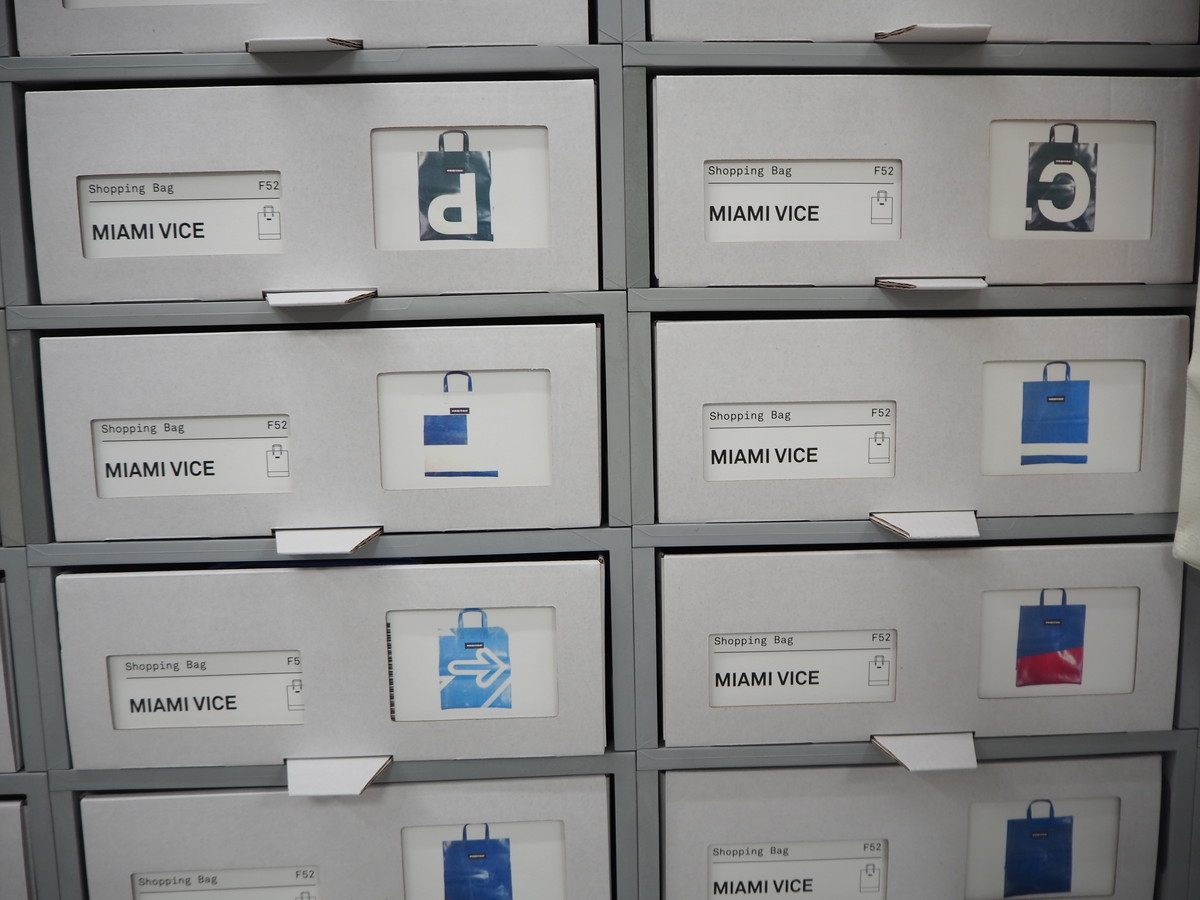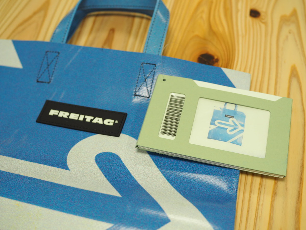 フライターグではすべてのバッグに「ハングタグ」と呼ばれる下げ札が付属しており、その中にバッグの写真が印刷されたIDカードが収納されています。そしてバッグはすべて、白いダンボール製のボックスに収納。ボックス正面には商品の写真がプリントされたバーコード入りのカードがついていて、中に入っているバッグのデザインがわかるようになっています。