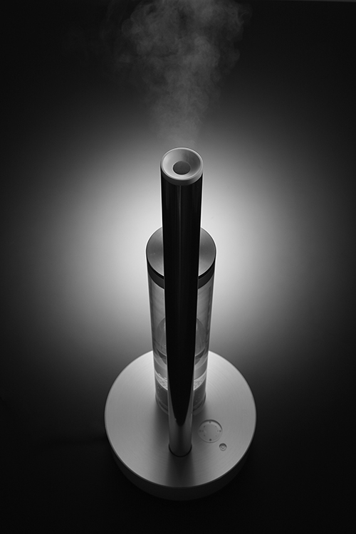 水に超音波振動を加えてミスト状にするので、ハイパワーでありながら消費電力が低く(1時間あたり約 0.7 円)、吹き出し口に触れても熱くないのが特徴です。水の量がひと目でわかる透明タンクと、上部の蓋を開けるだけで給水できるつくりも便利。