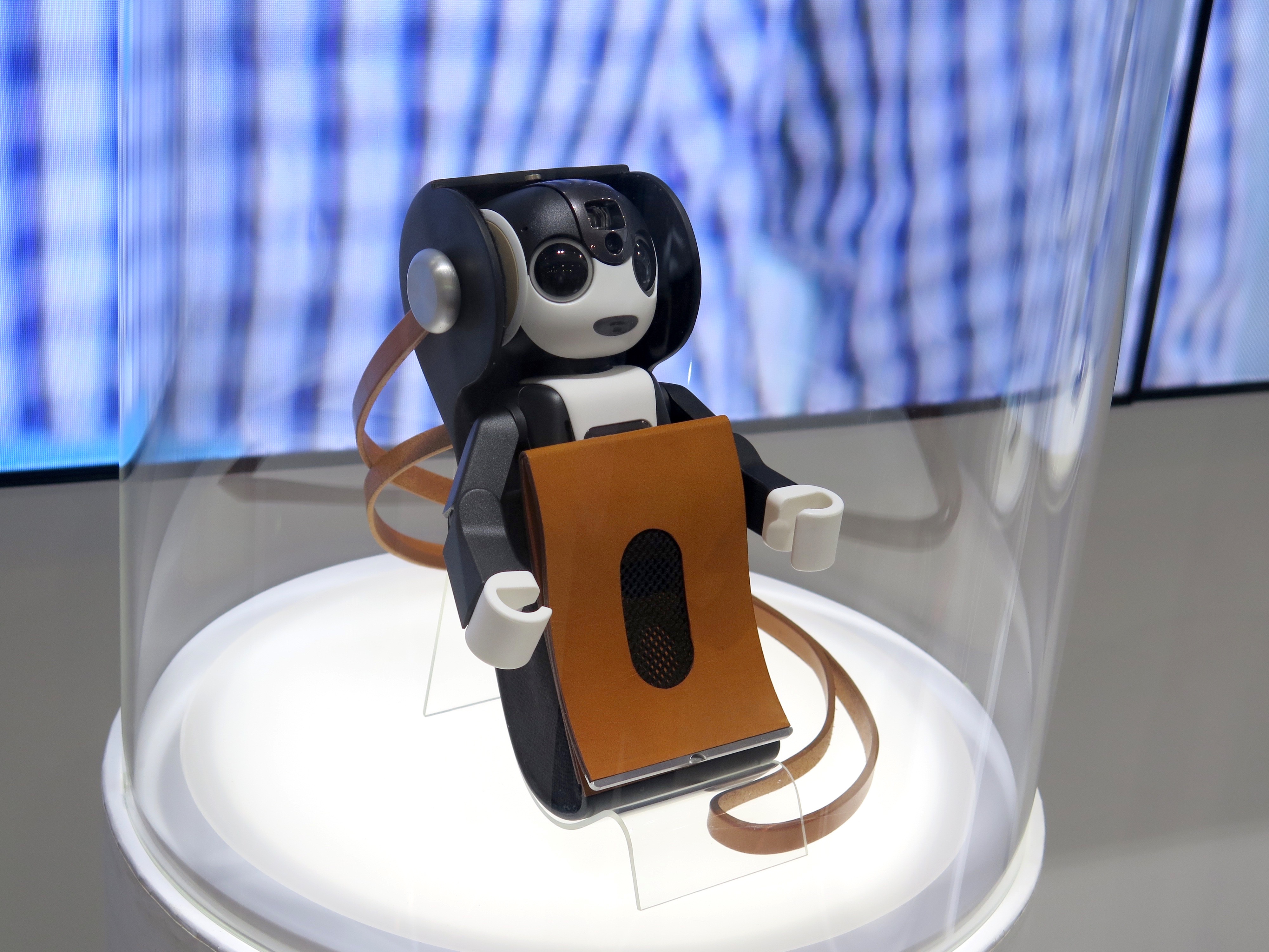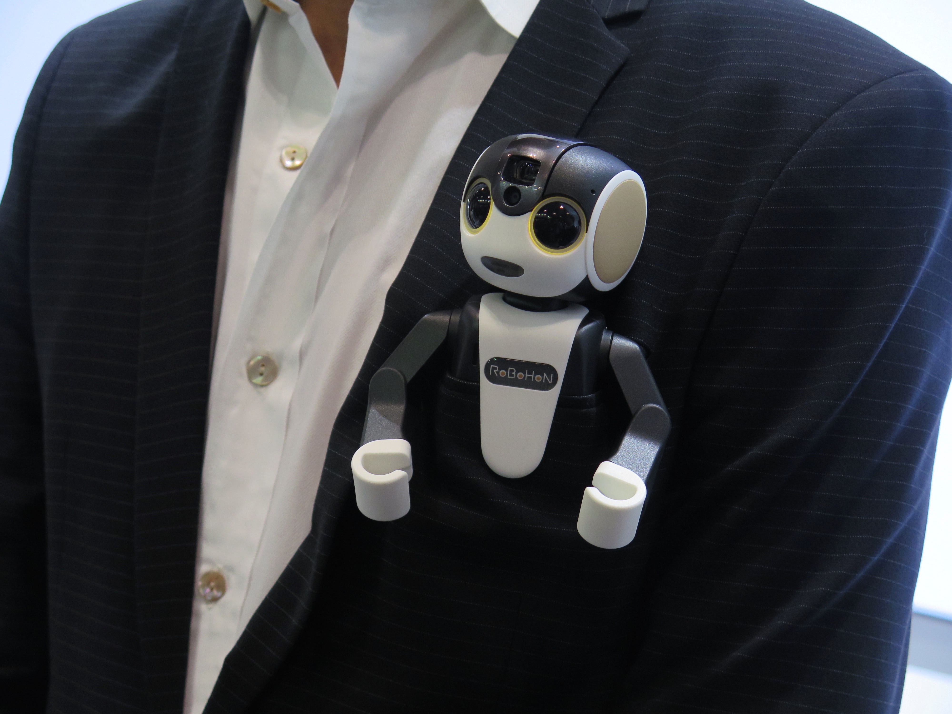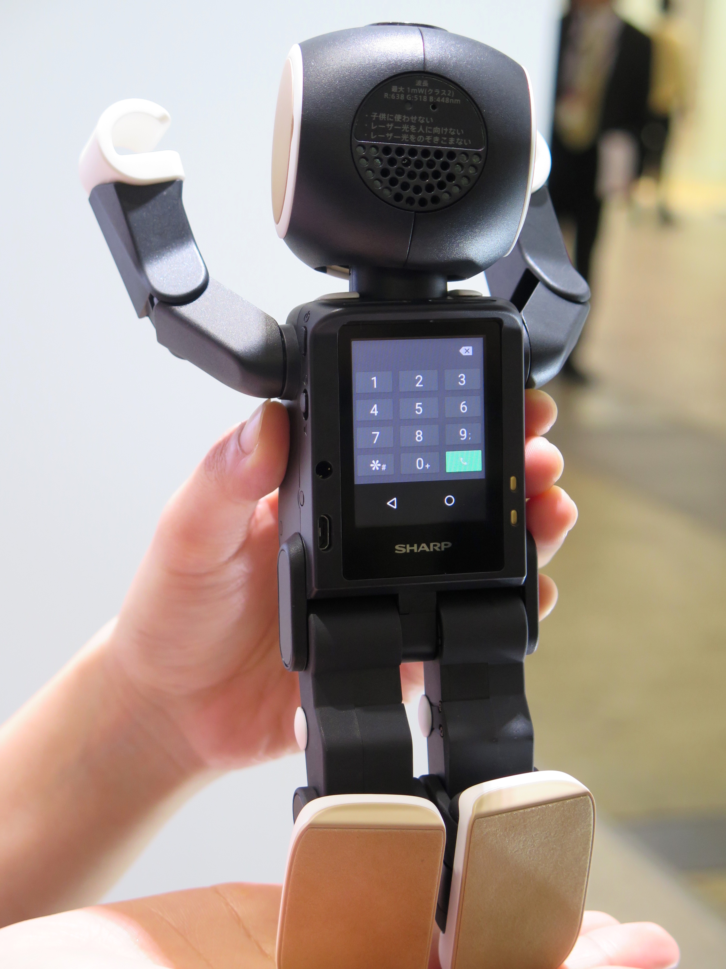 RoBoHoNは約390g。背中に約2インチのタッチディスプレイを搭載し、そこで設定をしたり、電話番号を表示させて、電話をかけたりする仕組み。ですが、ほとんどの操作は、RoBoHoNに話しかけるだけで完遂できることを目指しているそうです。