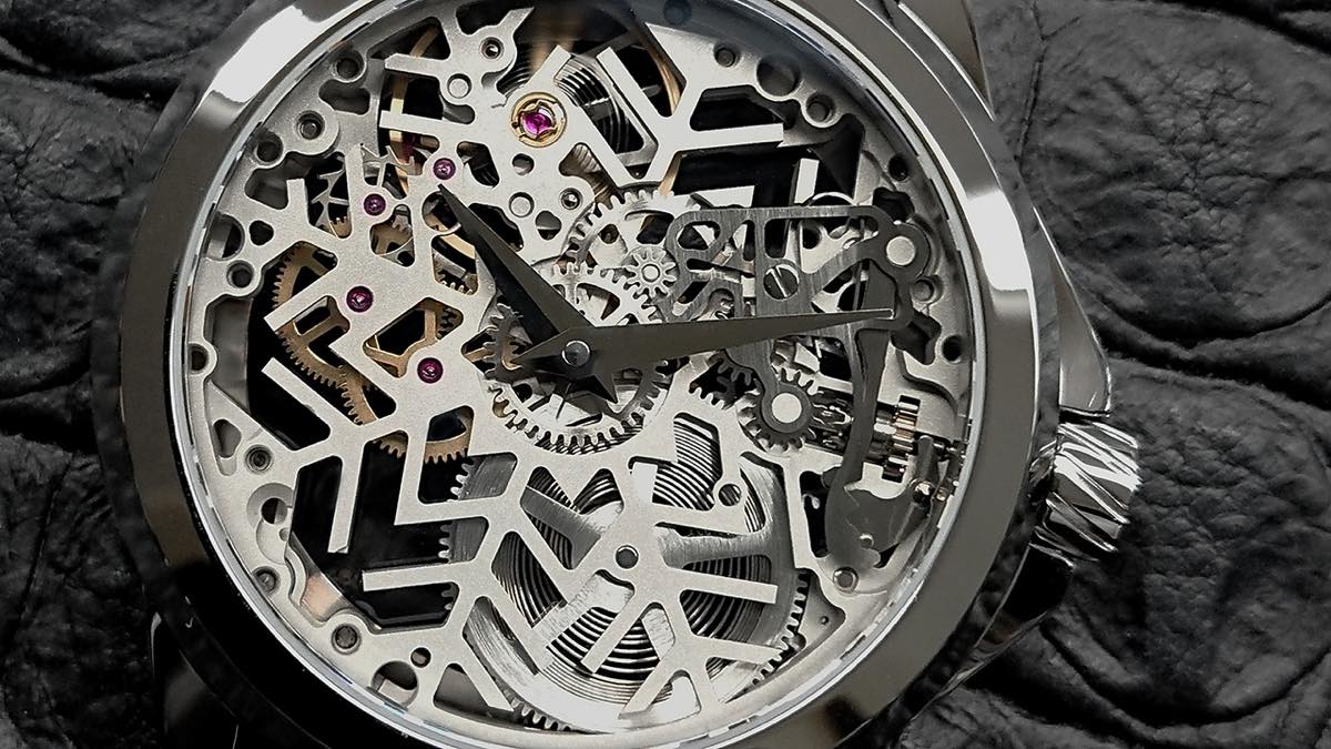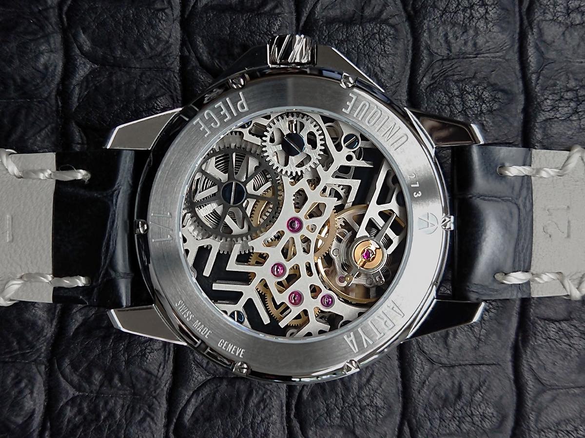 今回の新作は、アーティアが本拠とする地元ジュネーブ、すなわち高級時計の天国 “アルプス” へのトリビュートとして製作されたもの。「Son of Alps SNOWFLAKE」の名の通り、ケース前面には雪の結晶が大きく枝葉を広げ、その奥で白く透け感のあるムーブメントが、静かに時を刻みます。