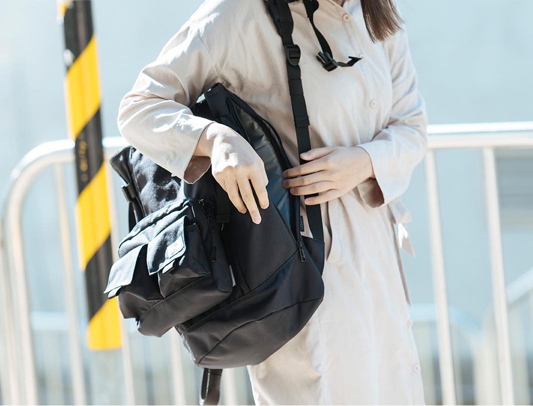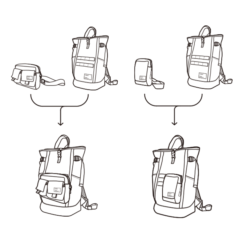 簡単・安全にデイパックに取り付けられるショルダーバッグも、必要に応じた容量の拡大ができるアイテムです。マフロントポケットのグネットボタンは片手で簡単に開閉できるので、片手がふさがっていてもラクに中身の出し入れができます。