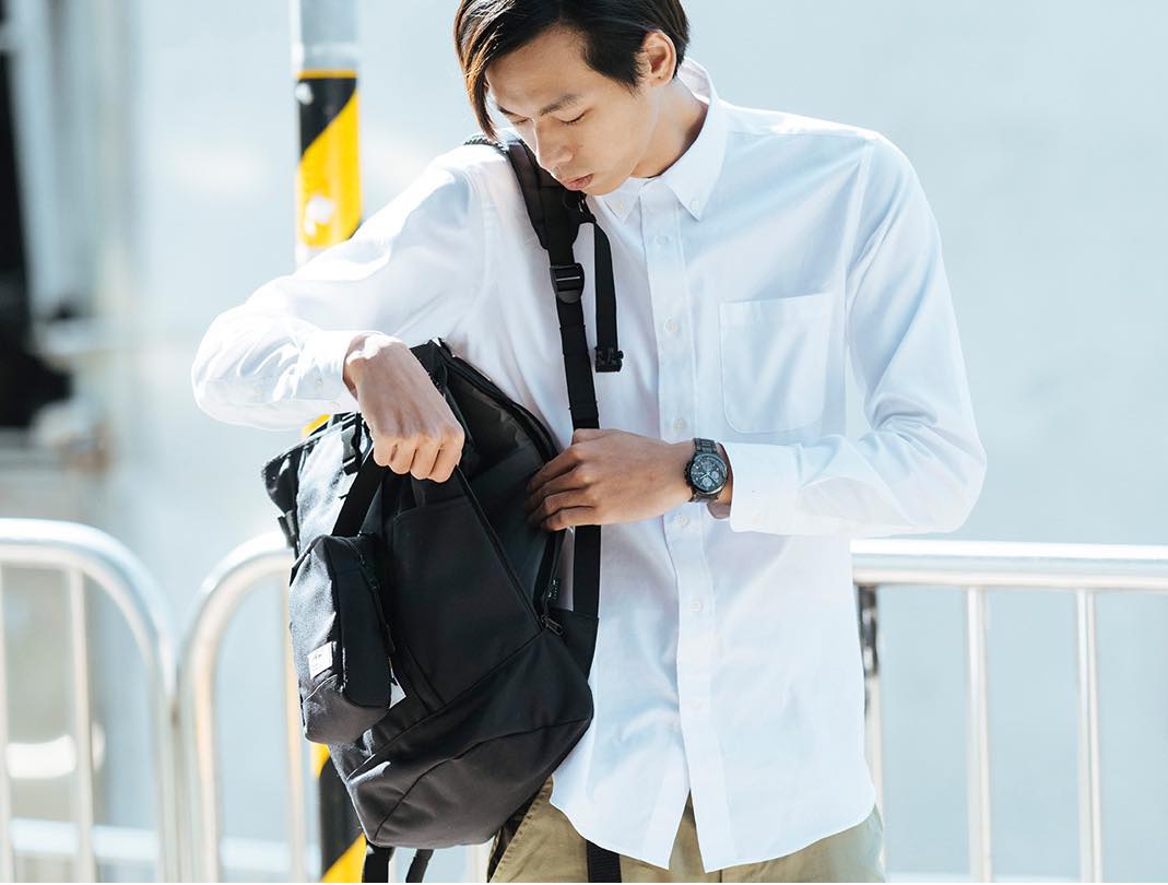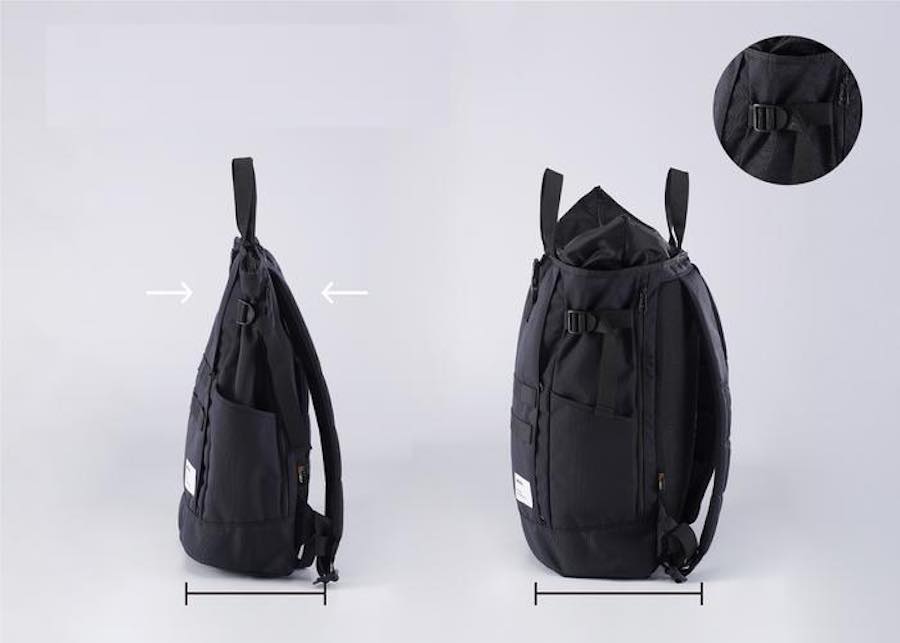 また、上からも横からも開けられ、必要なものをすぐに取り出すことが可能。中身が少ないときには調整できるサイドベルトをタイトに締めればすっきりスリムな形状になり、荷物が多いときにはトップにあるバックルを緩めれば簡単に容量を拡張できます。さらに、トップに備えた雨水を防ぐロールアウト式のインナーを使えば、防水だけでなく約4Lの容量を拡大することができるのです。これにより、デイパックの容量は最大24Lになるというつくりです。