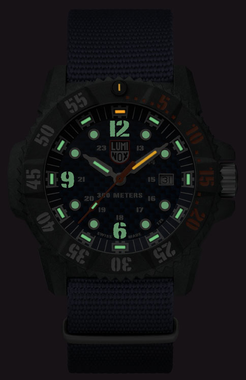 また、ルミノックス最大の特徴である25年間の自己発光「ルミノックス・ライト・テクノロジー」も搭載。アイスブルーとオレンジの淡い光が、夜間や暗所での高視認性をしっかり確保しています。