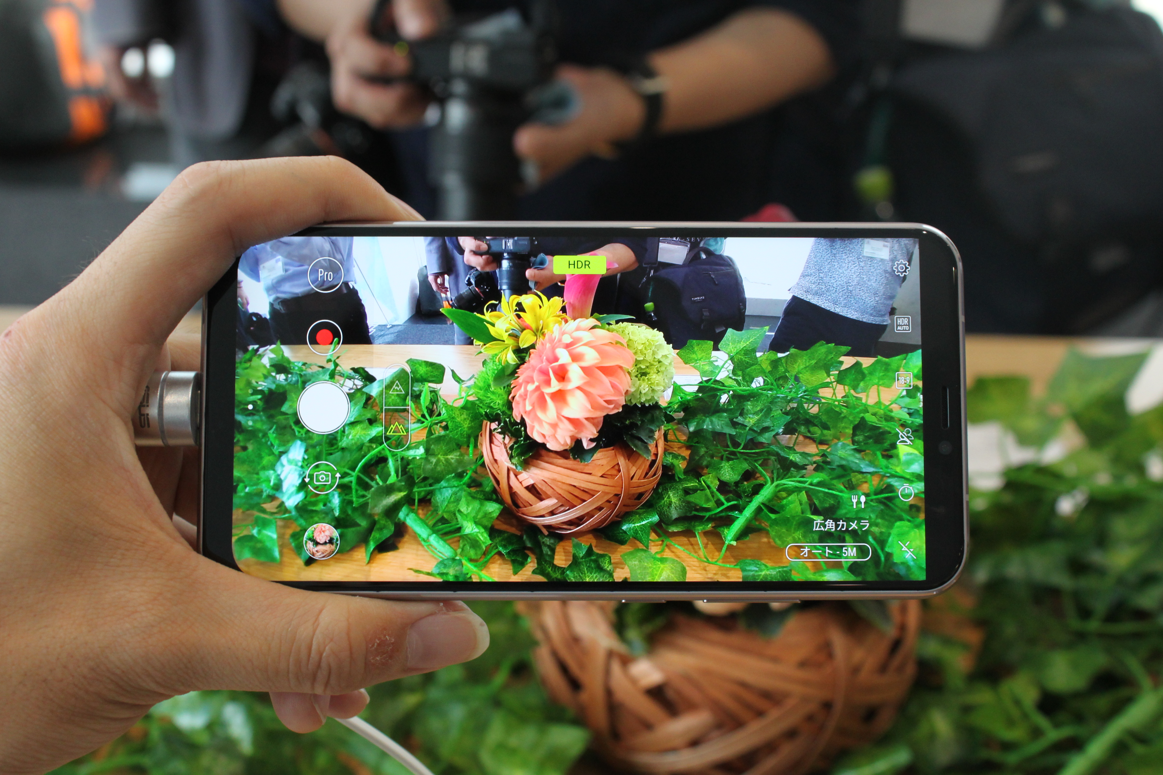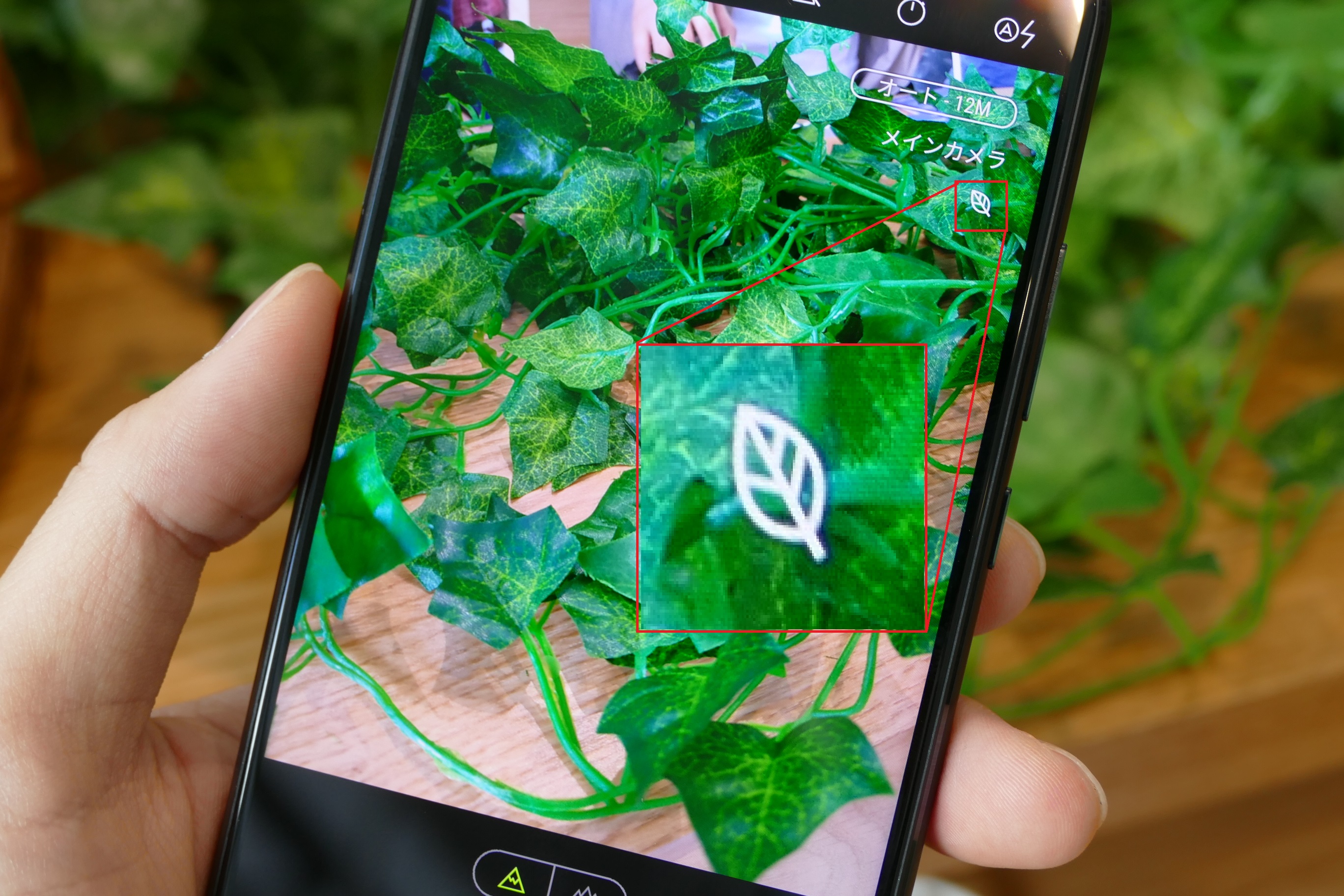 AIを活用し、シーンごとに最適な撮影モードを選択できることも特徴です。例えば、会場に設置された葉っぱにカメラを向けると撮影シーンを「グリーン」と認識。葉っぱのマークが表示されました。