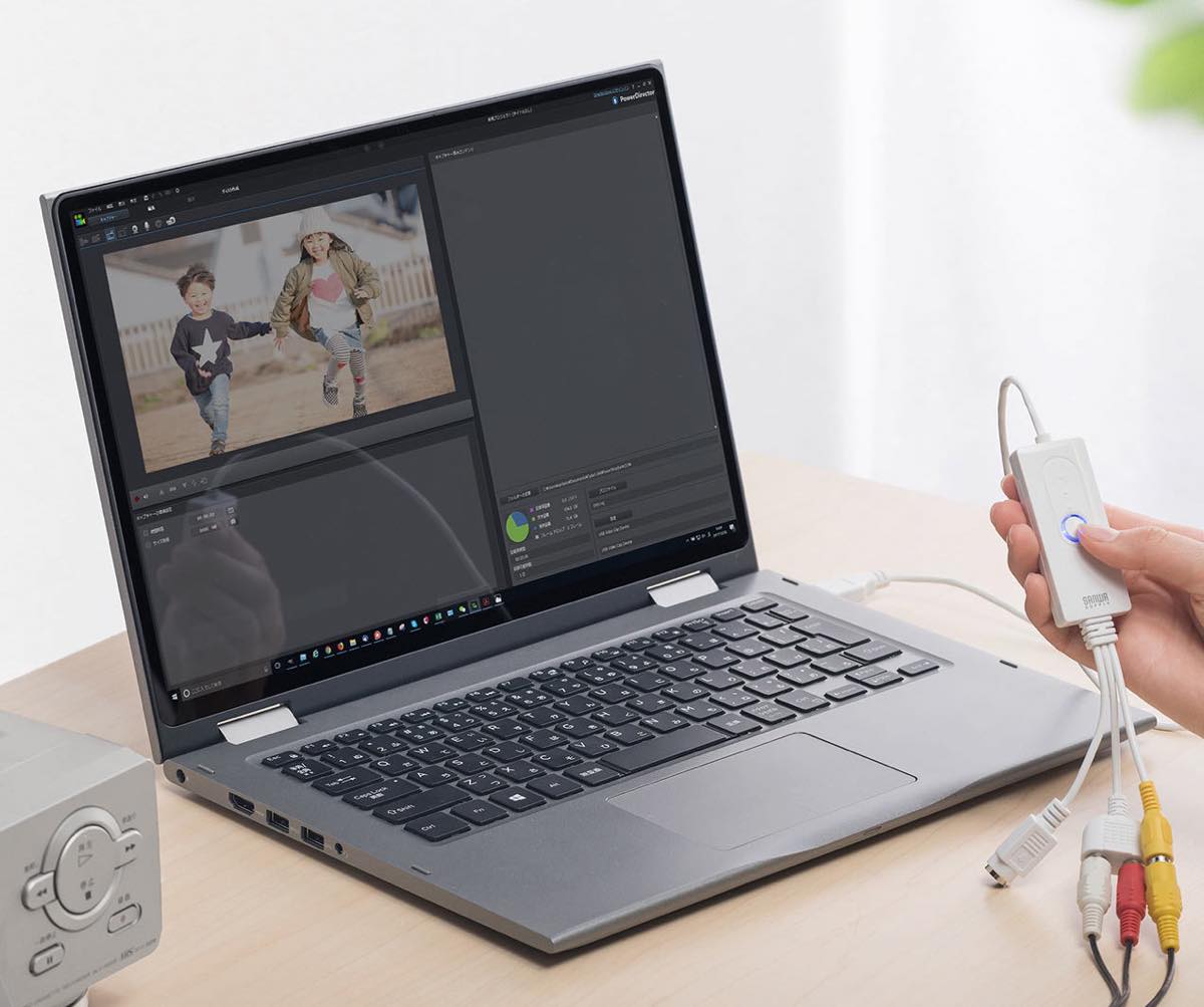 Windows、Macどちらのパソコンにも対応し、付属の専用ソフトを用いて、貴重なビデオ映像を簡単にデジタル化できます。本体のスナップショットボタン(Macは非対応)を押せば、動画のキャプチャー中であっても、同時に静止画をキャプチャーすることが可能。大切な思い出の一場面を写真として保存できます。