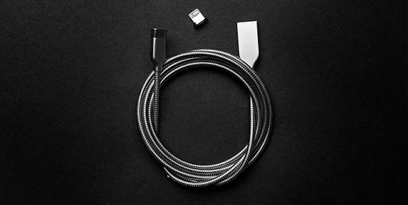 メタリックなルックスからして、ちょっと他とは違うことを感じさせる「アンカーケーブル」。ステンレススチールを採用した特殊構造がケーブル強度のアップを実現、開発元の耐久テストによれば一般的な高強度ケーブルの4〜6倍もの折り曲げ耐性を持つとのこと。