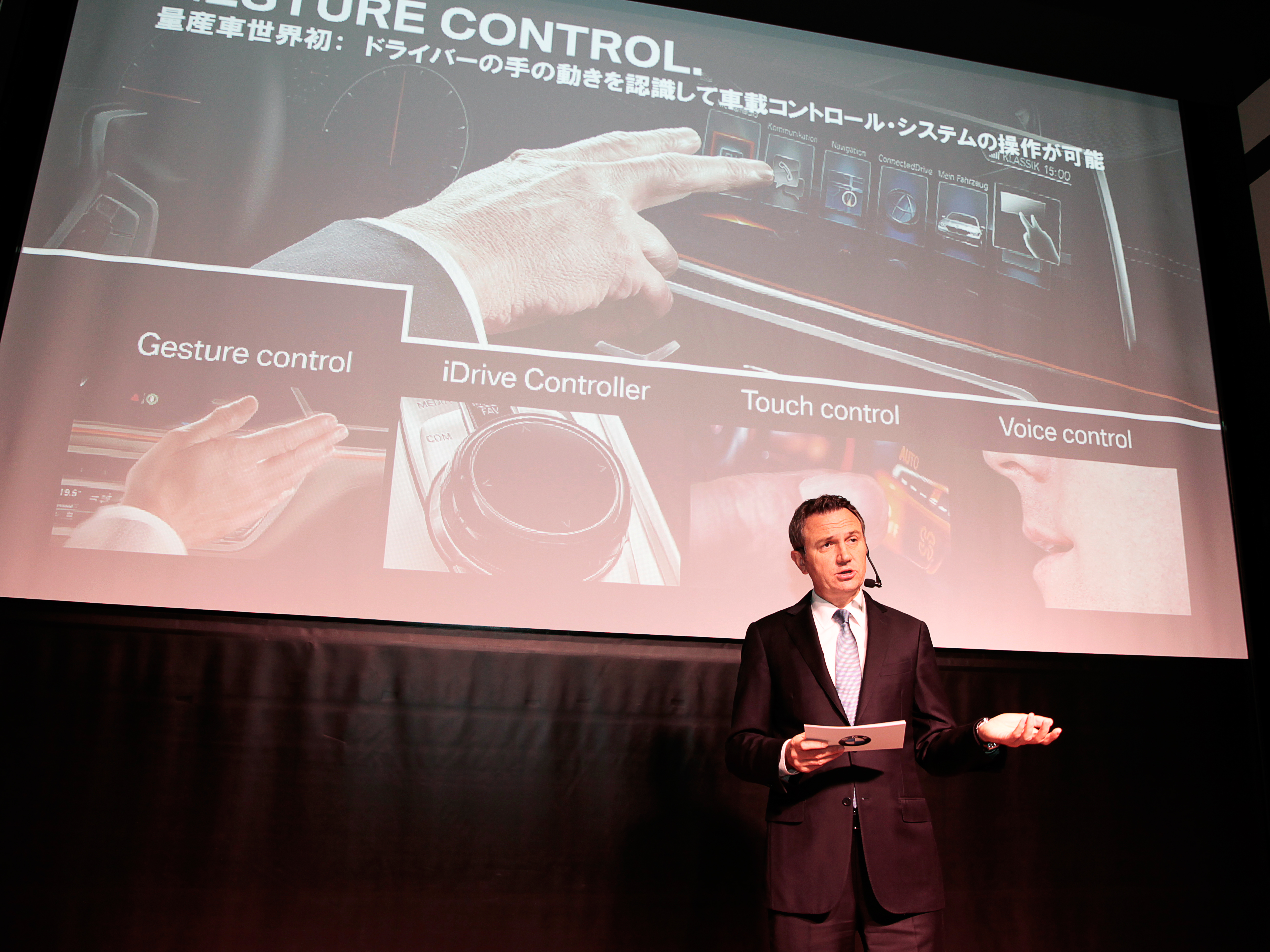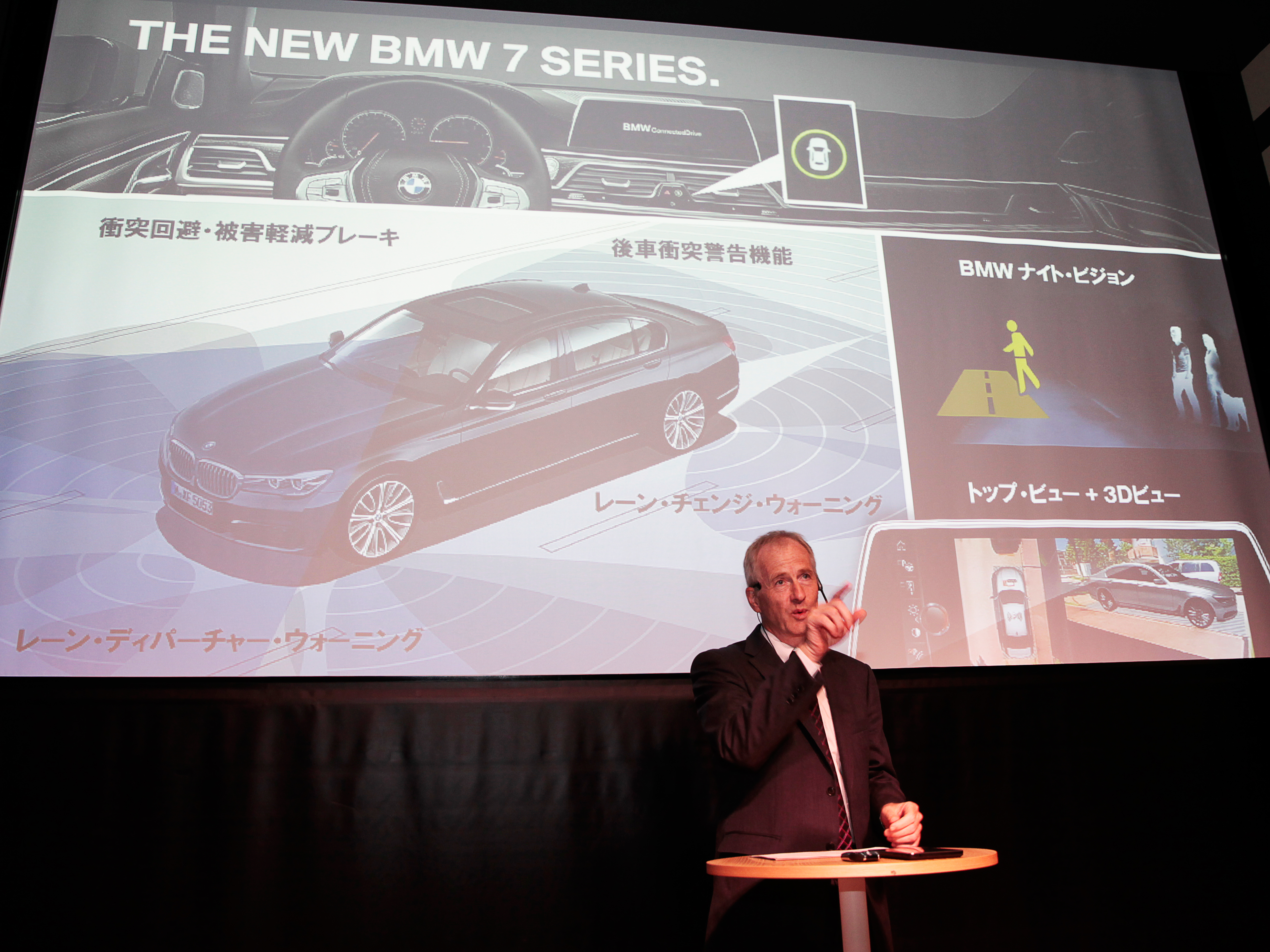 続いて、デベロップメント・ジャパン本部長のルッツ・ロートハルト氏は、7年前にニュー7シリーズの開発を始めるに当たり、1万人にのぼるBMWのエンジニアたちに「2015年にはどんな技術が実用化されているかを予想させた」といいます。モデルライフの長いフラッグシップは、近未来を見据えてつくらないと、すぐに陳腐化してしまうからです。