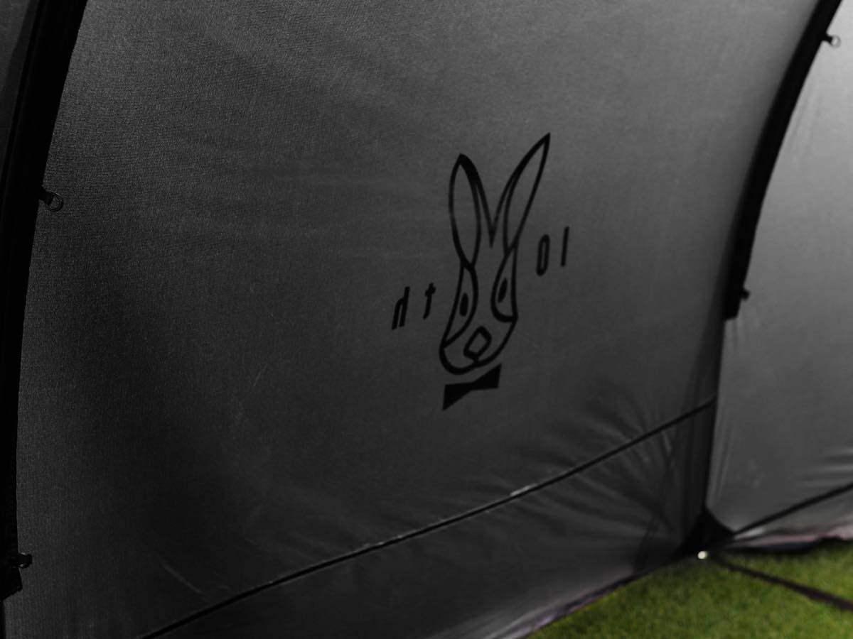 軽量かつ丈夫で登山用テントにも使われるシリコンコーディング40Dナイロン生地を採用し、重量は約5.8kgと軽い! ブラックカラーを選定し、ベージュよりも遮光性は高い。10周年特別仕様のウサギロゴのプリントも付いている。