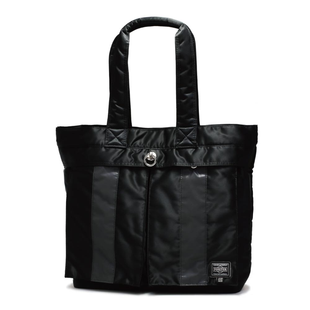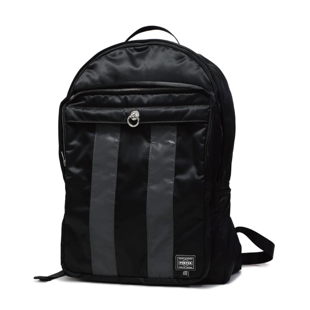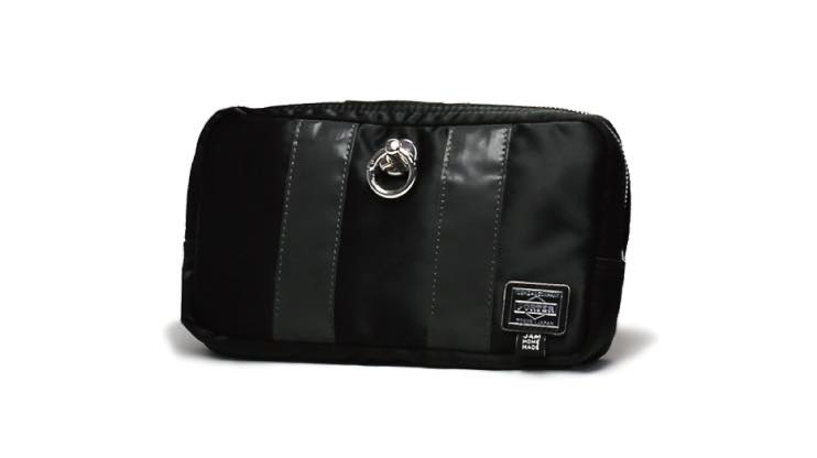 特殊な圧着プレス技術を要するブラックナイロンの表面に、ブラックのリフレクターラインを大胆に配置。ワンポイントに光るビッグサイズのJAM EYELETもあしらい、スタイリッシュに仕上がっている。カラビナ仕様の丸カンにはチャームなどの取り付けも可能だ。
