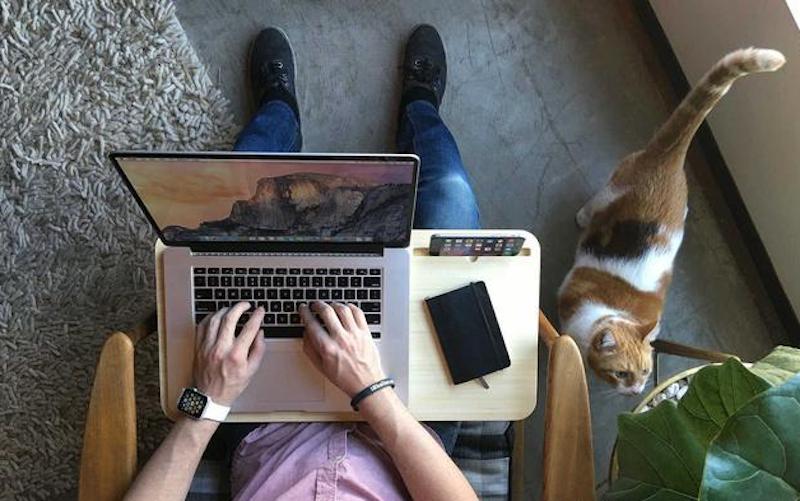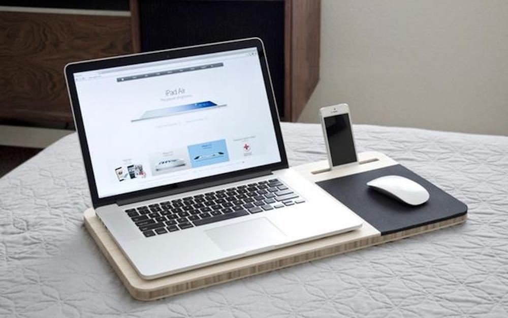 膝の上の使用は、無理な姿勢で背中や首を痛めるだけでなく、PCからの発熱やスマホやマウスなどの周辺機器が置けないといった悩みも誘発し、作業効率に大きな影響を及ぼしているのです。こうした悩みを解決してくれる救世主としてアメリカで生まれたのがMacBook専用デスク・スパーキークリエイト「Slate 2.0」(1万1060円~5月22日現在)です。