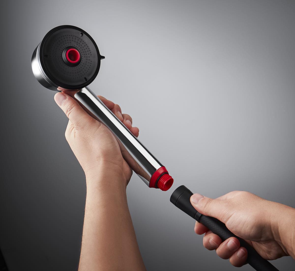 シャワーヘッドの取り換えは、ホースとの接続部をくるりと回すだけのお手軽設計。他メーカー接続アダプターを3個付属しており、ほとんどのメーカーに取り付け可能になっています。