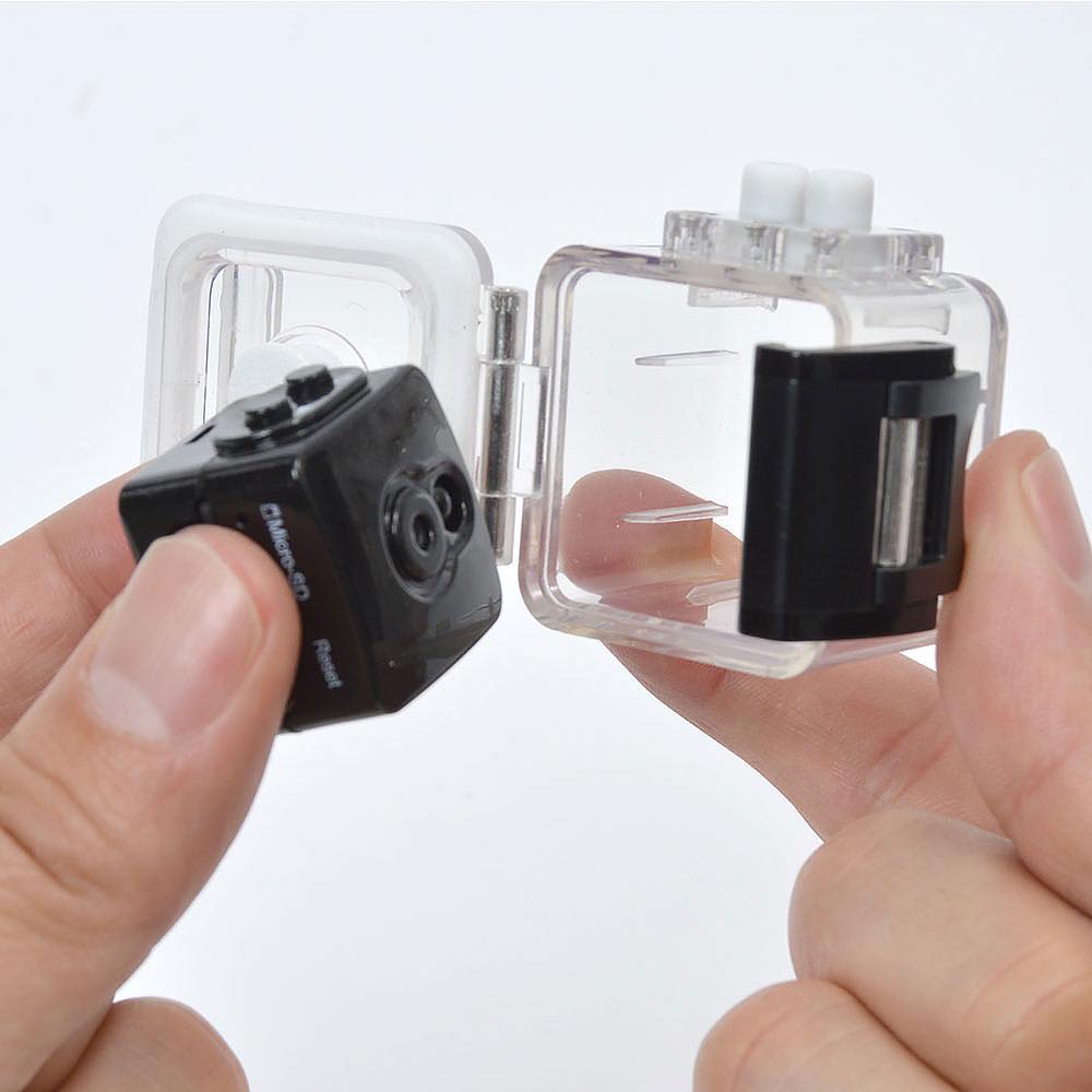 「指でつまめる防犯サイコロカメラ防水ケース付き」は、約25mmの立方体で重量はわずか12gの超軽量ミニサイズのサイコロ型防犯カメラです。付属の防水ケースに入れたままボタン操作が可能なので、雨でも使える防犯カメラとしてはもちろん、自転車などに取り付けてアクションカメラのように使ったり、海や川などの水の中で使える防水カメラとしても活躍します。
