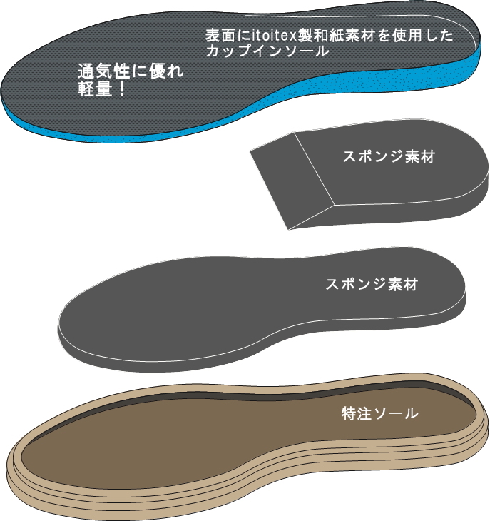あらかじめ足の形に成形されたカップインソールにはなんと和紙素材を使用。大阪のITOI生活文化研究所が開発した、耐久性と速乾性を兼ね備えた和紙素材ITOITEXを貼り付けたカップインソールは足馴染みが良く、汗もしっかり吸収して蒸れにくい快適な履き心地を実現しています。