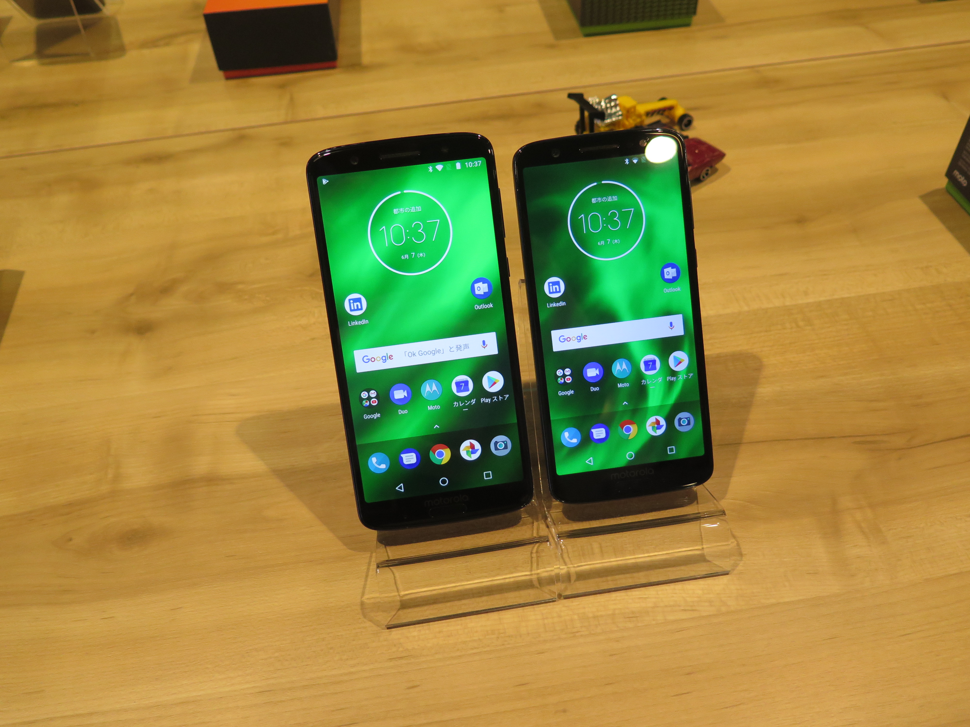 ▲右がmoto g6で、左がmoto g6 plus。デザインは共通で、ボディカラーはディープインディゴのみ