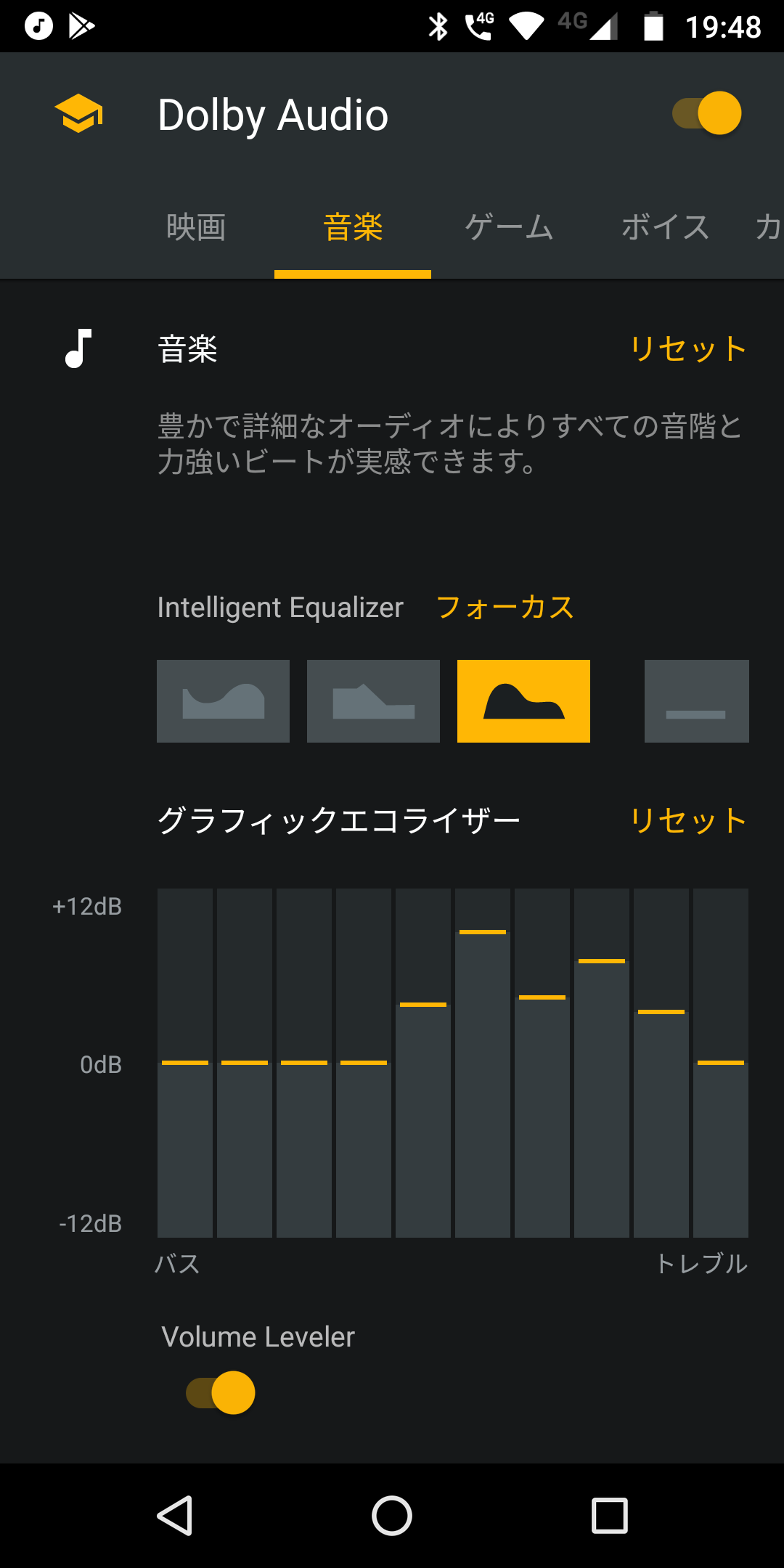 もうひとつ個人的に気に入ったのが「Dolby Audio」。ドルビー社が提供する高音質化技術ですが、これをオンにするだけで、音質にぐ〜んと変わります。音に厚みが出て、ボリュームも若干大きくなります。イコライザー機能で、自分好みの音質にも調整できます。3万台のスマホで、内蔵スピーカーでもこんなにいい音で聴けるスマホはなかったかも…なんて思ったりしました。