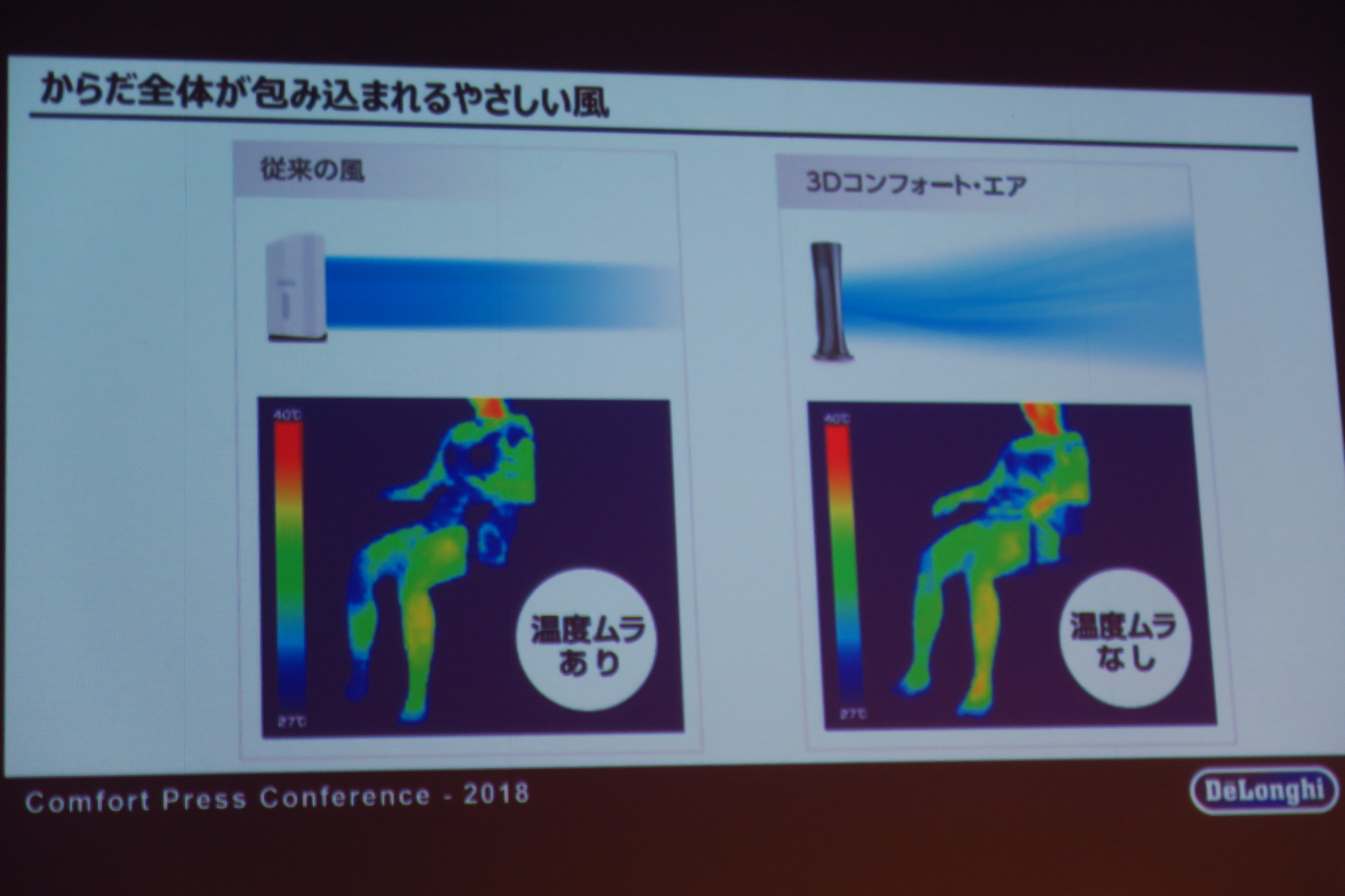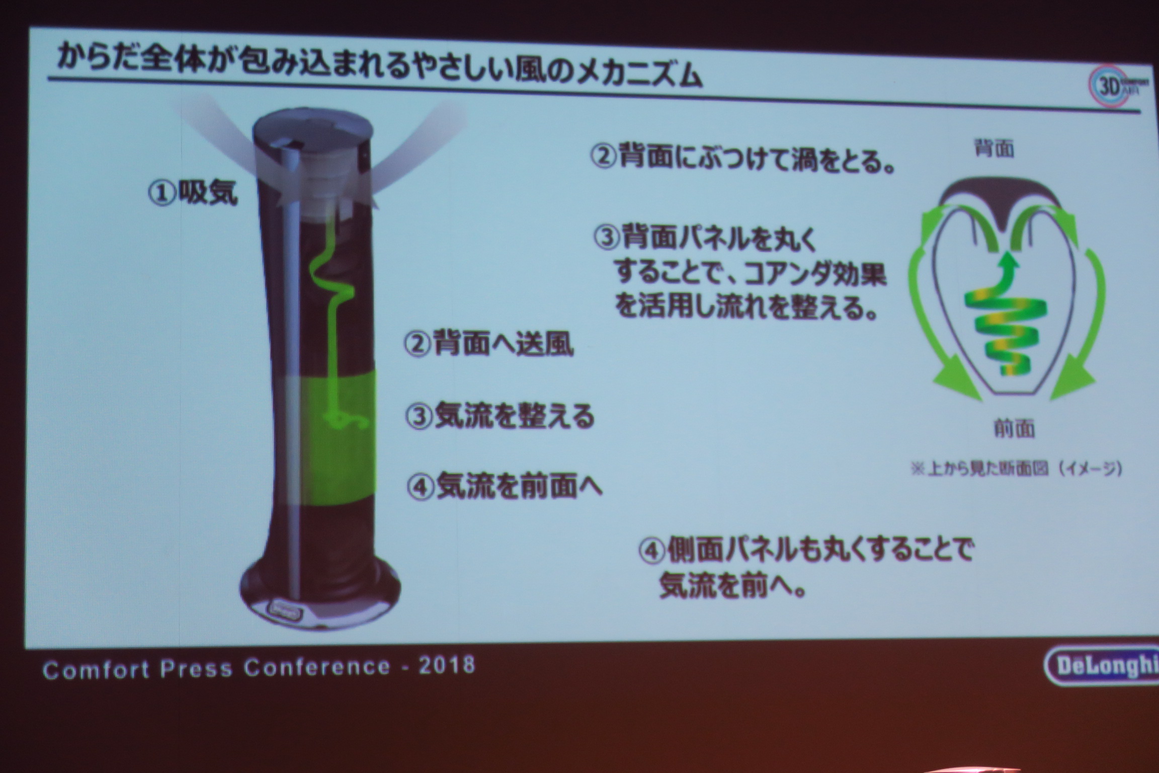 このファンのいいところは、何といってもその送風機能にあります。独自の「3Dコンフォート・エア テクノロジー」を採用し、ジェット気流が物体に引き寄せられ、物体がなめらかに曲がっていればそれに沿って流れる「コアンダ効果」を応用。