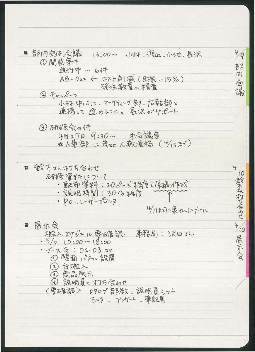 その「ソフトリングノート」をビジネス向けに改良したのが「ソフトリングノート<Biz>」。ページの端に日付とタイトルが書き込めるので、内容を確認しなくても目的の記録が探しやすくなっているんです。しかもタイトル部分を案件ごとに色分けすれば、ノートを閉じたままでもひと目で必要な案件を見つけられます。