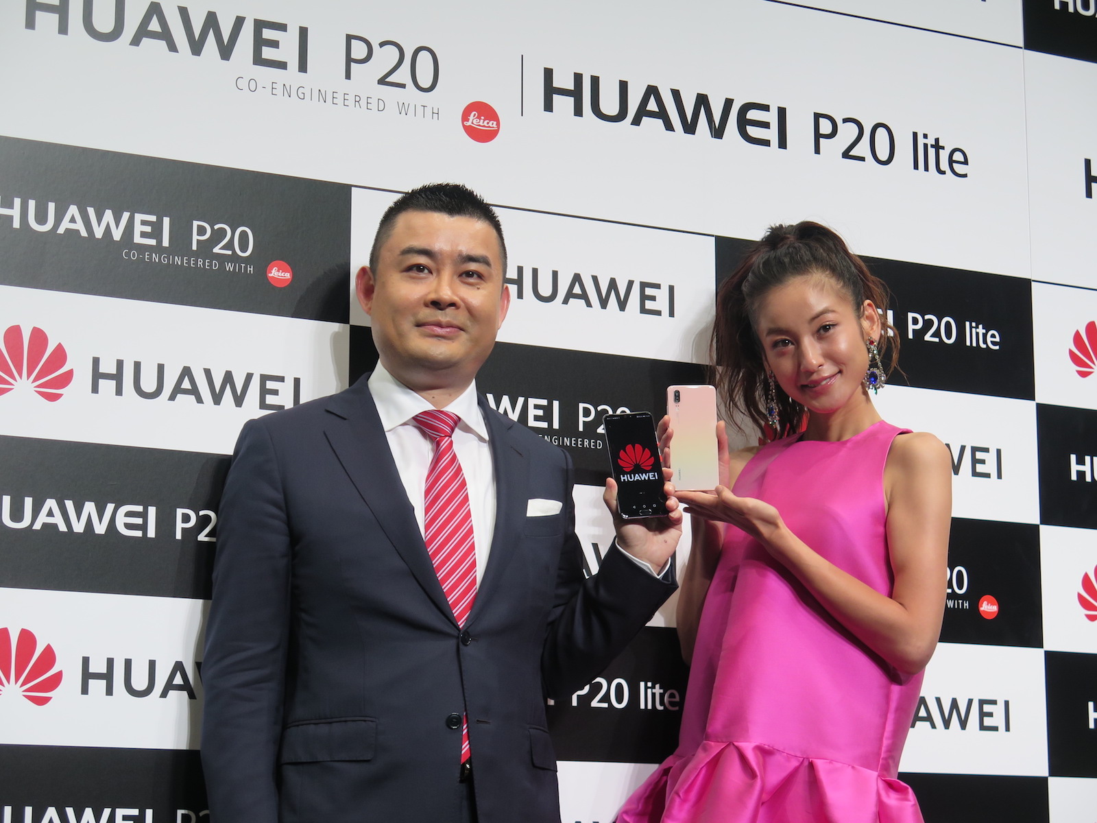 ▲発表会には、ゲストとしてモデルの西山茉希さんが登場し、P20で撮った写真を披露した。左は、ファーウェイデバイス 日本・韓国リージョン プレジデントの呉波氏
