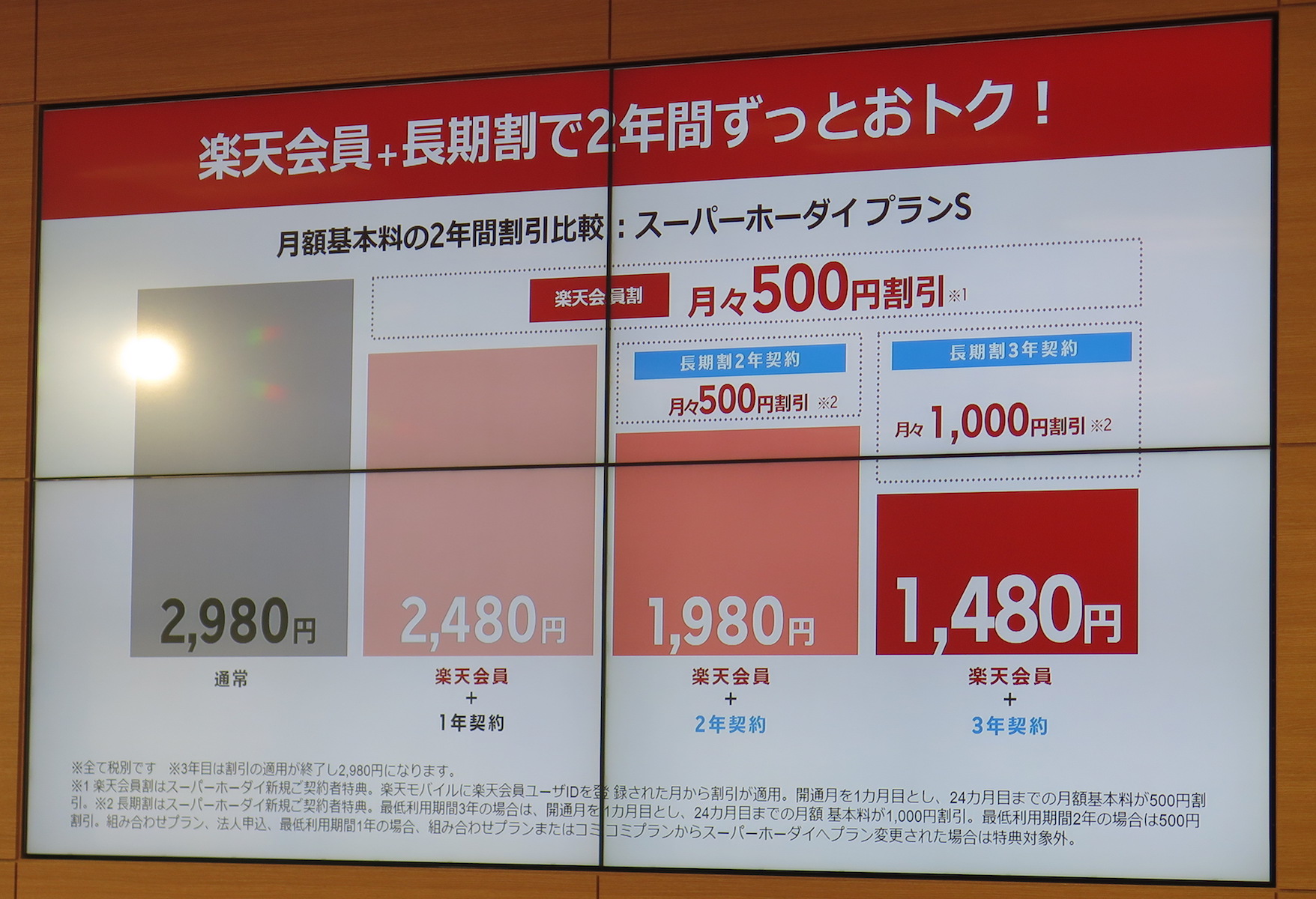 新しい「スーパーホーダイ」は、最低利用期間を1年、2年、3年から選べて、2年を選んだ場合は月額500円×2年、3年を選んだ場合は月額1000円×2年の「長期割」が適用されます。選択する最低利用期間に関係なく、「楽天会員割」として月額500円×2年の「楽天会員割引」も適用されます。
