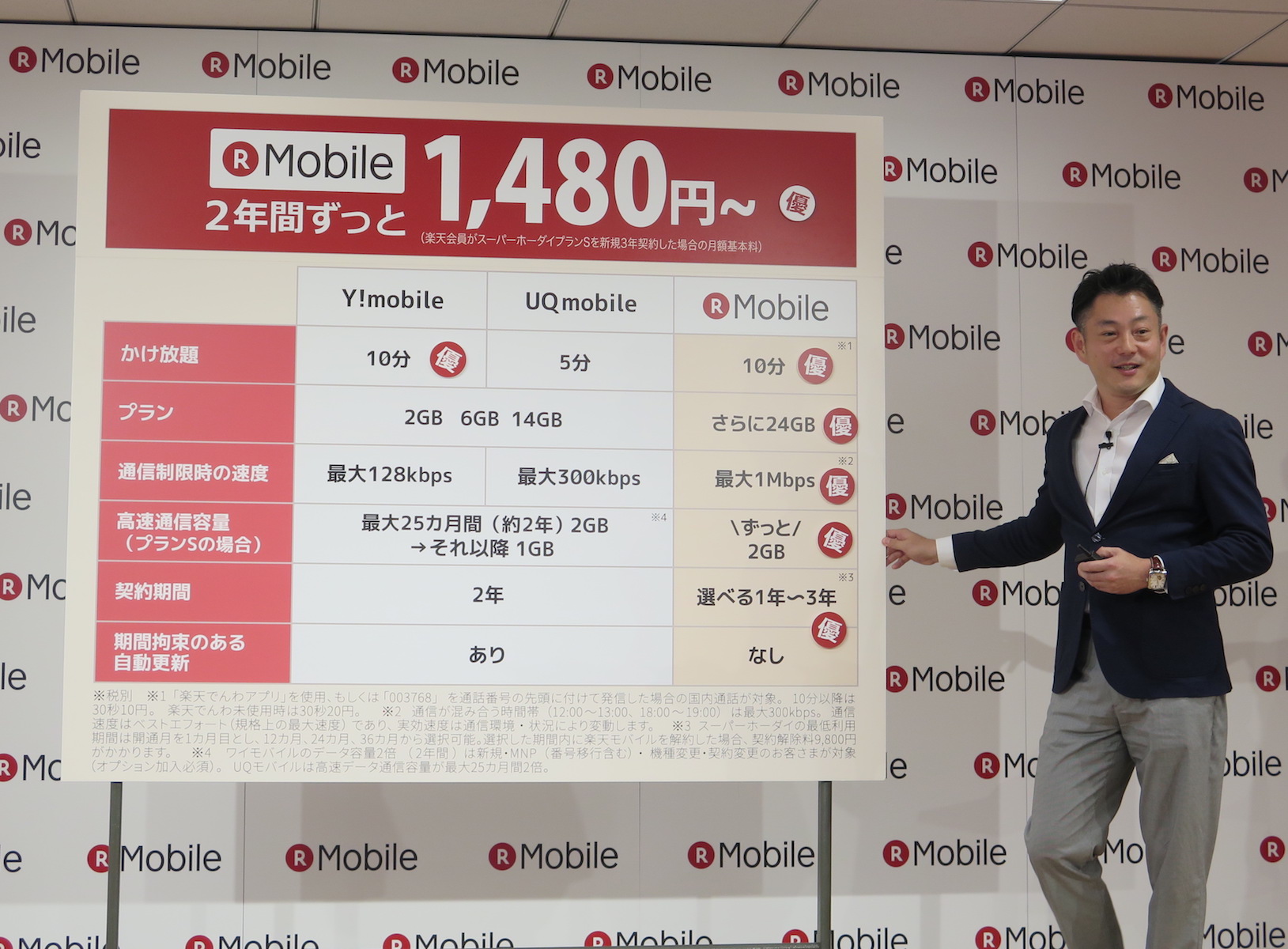 ▲新プランのプレゼンテーションを行った、楽天株式会社 執行役員 楽天モバイル事業の大尾嘉宏人氏が競合他社のプランと比較した場合の優位性を強調