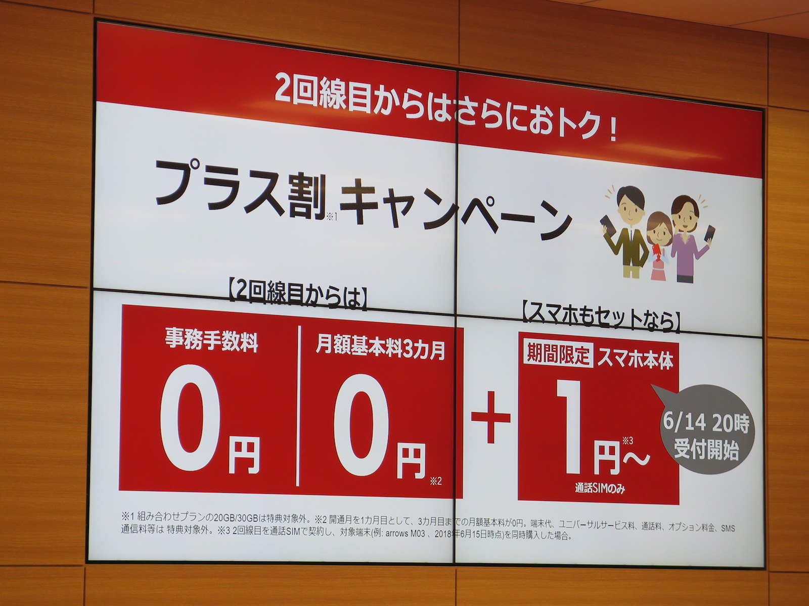 ▲複数回線を契約する場合に、スマホが1円から購入できる「プラス割 キャンペーン」も開始。1万円未満のスマホを選ぶと1円となり、それ以外の機種は1万円割引となる