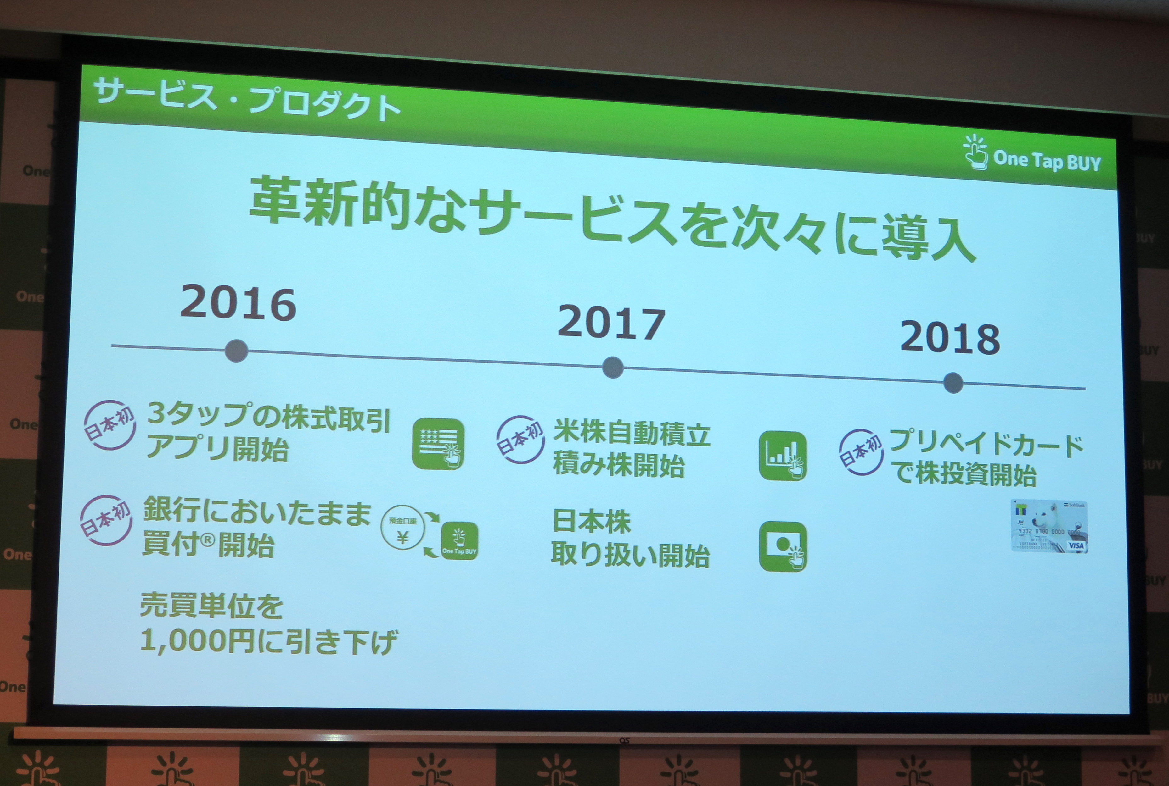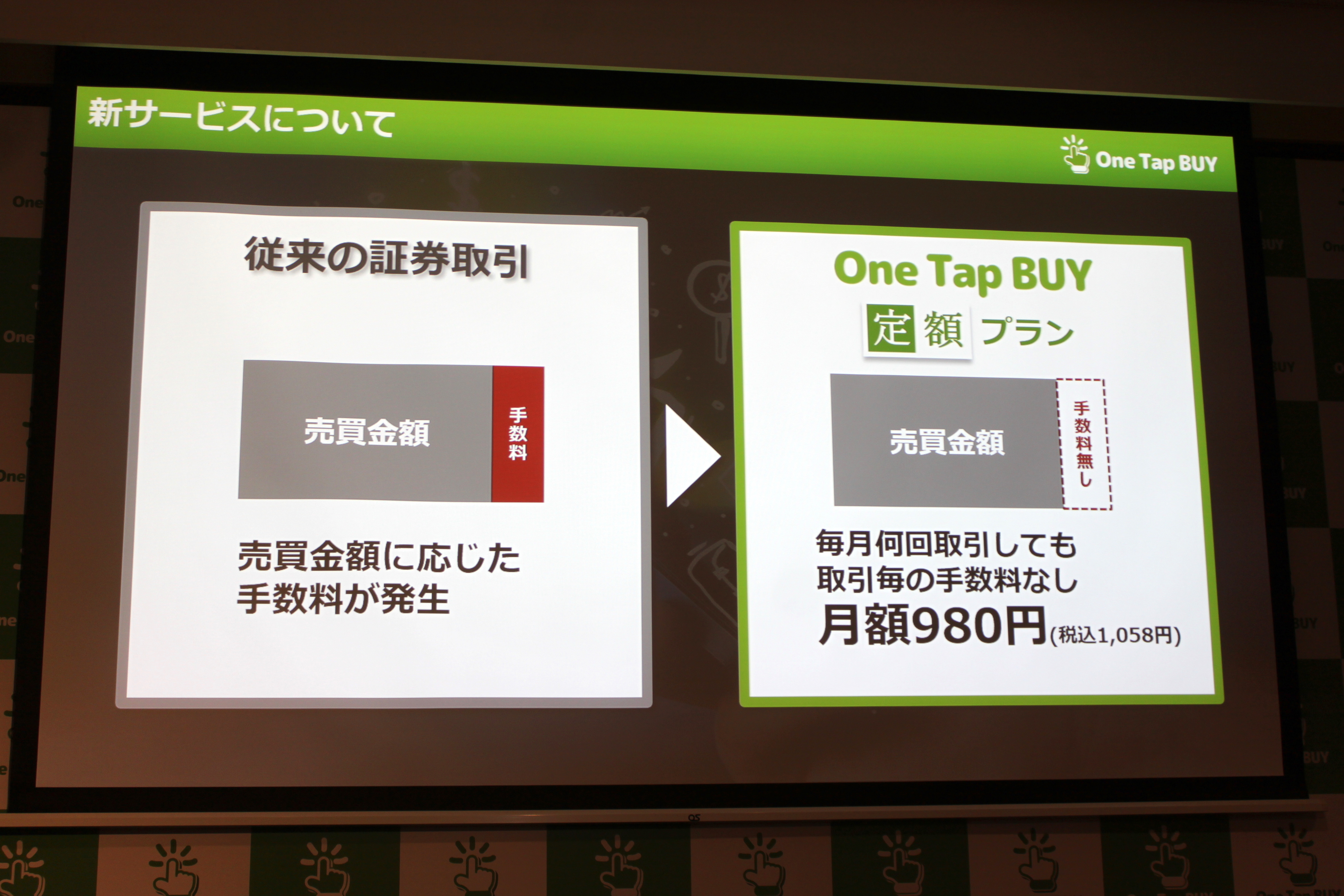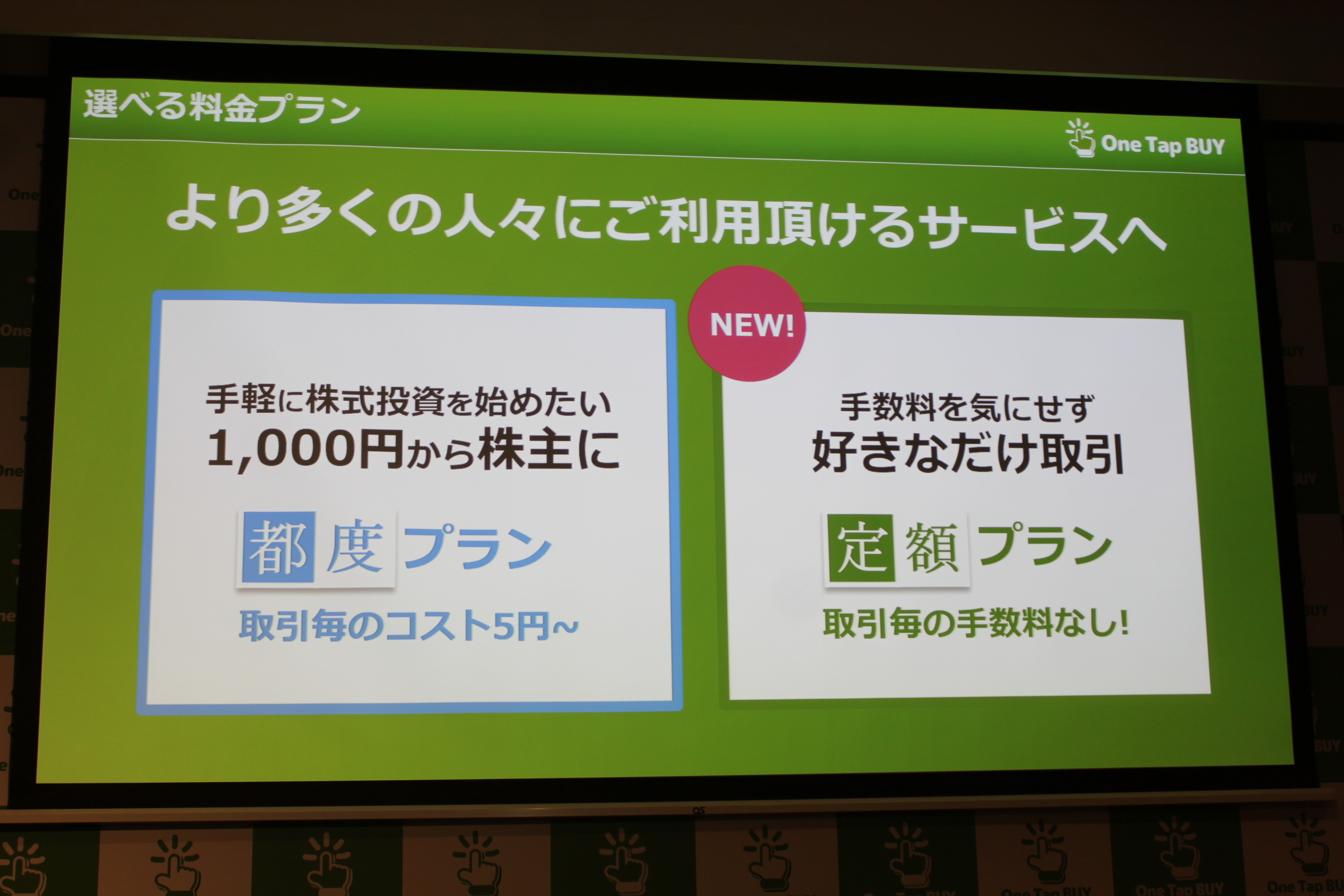 One Tap BUYによると、月に20万円以上売買する人には「定額プラン」のほうがお得とのこと。日本株は月額固定制という証券会社はありますが、月額980円(税別)は業界としては破格で、米国株については業界初の導入となります。また、取り扱い銘柄についても、現在の66銘柄の取り扱い銘柄を、近いうちに100銘柄にまで拡大する計画があることも発表されました。
