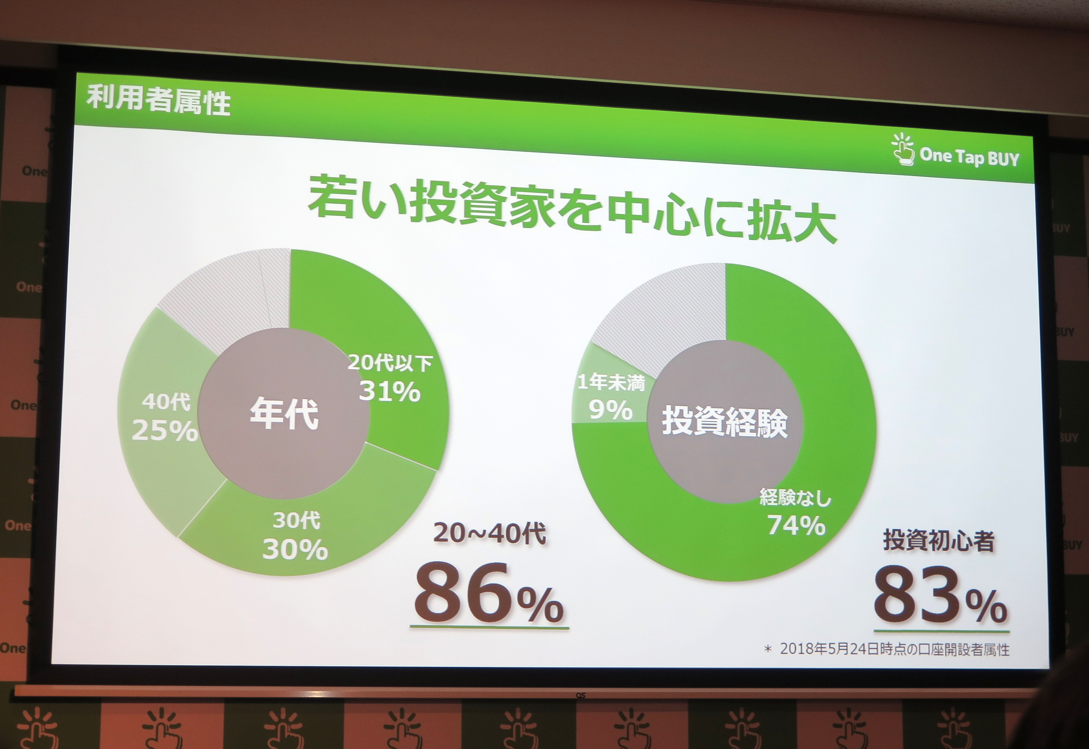 One Tap BUYは、1000円単位という少額で投資を始められ、しかもスマホアプリで簡単に取引ができることで人気のサービスです。そのため、利用者が20〜40代で86%を占め、平均取引額は2万円以下とのこと。