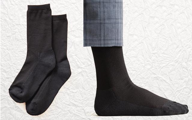 商品としては、クルータイプのリブ靴下とスニーカータイプのカノコ靴下の2タイプがあります。クルータイプのリブ靴下は、ビジネスシーンに合わせやすいハイゲージのリブ編みで上品に仕上がっています。スニーカータイプ(くるぶし)のカノコ靴下は、プライベートシーンで活躍出来るワンランク上のイメージです。