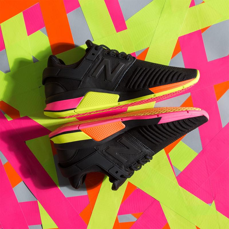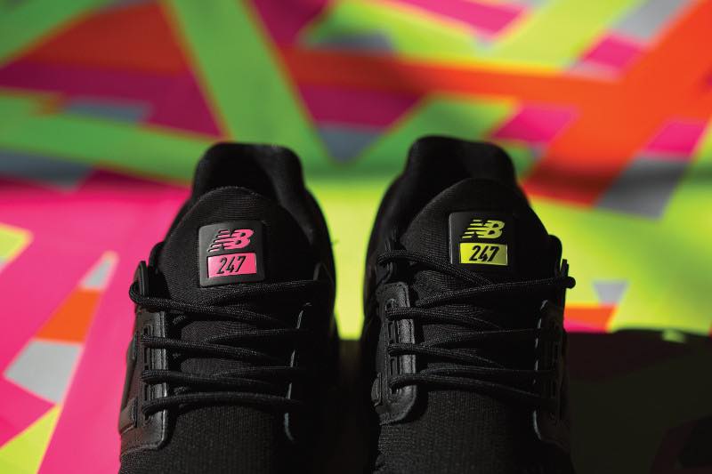 「MS247 TT(BLACK)」は、ブラックで統一されシンプルで洗練されたアッパーとは対照的に、ソールやタンラベルには鮮やかに目に刺さる蛍光色を複数使い、しかも左右色違いという、遊び心のある一足です。ミッドソールはボリューム感のあるデザインで、REVLITE(レブライト)素材で軽く、優れたクッション性を誇ります。
