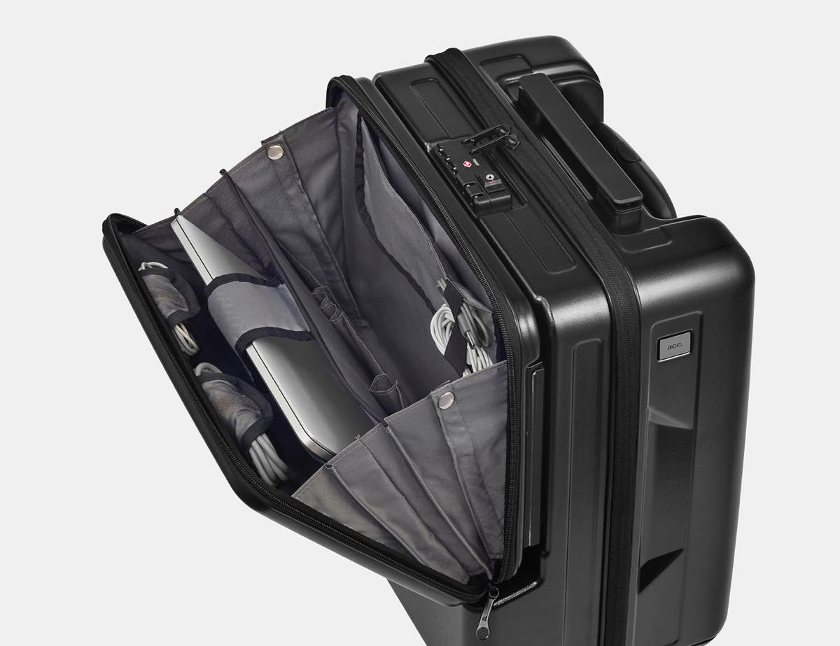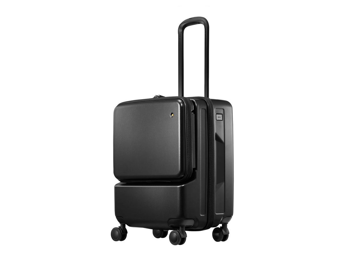 「ace. DP キャビンワン」は、2泊前後の出張に最適なコンパクトサイズのトロリーバッグ。一見何の変哲も無いポリカーボネート製トロリーですが、特筆すべきはパソコンやモバイルバッテリー、電源アダプターなどをまとめて収納できる前ポケットの存在です。ファスナーロックを外して上方向にスライドさせれば、このポケット部分だけがトロリー本体から外せる仕組みになっています。
