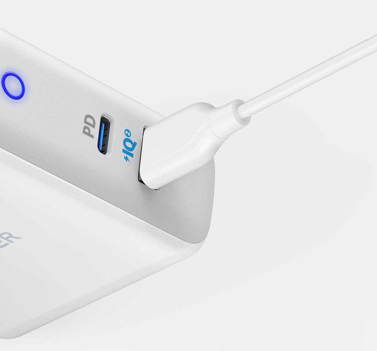「PowerPort II PD – 1 PD and 1 PowerIQ 2.0」は、USB Type-AとType-Cそれぞれでフルスピード充電を実現できる、2ポート搭載の充電器。 USB Type-Cポートは最新充電テクノロジー “USB Power Delivery” に対応、最大入力30WまでのUSB-C機器に充電できるようになっています。一方USB Type-Aポートは、Anker独自のテクノロジー “PowerIQ 2.0” を搭載、こちらは接続機器を自動識別、それぞれの機器に適した速度で充電可能。