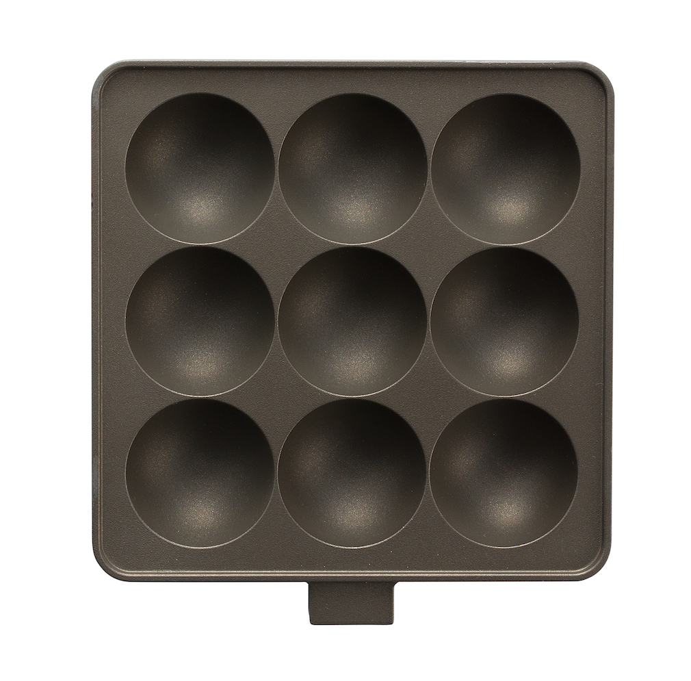 使いやすさの秘密は、9つの丸い焼面。本体内部にはノンスティック加工が施されているので、 食材がこびり付きにくい仕様に。しかも本体とハンドルが分離するので、テーブルに並べる時も場所を取らず、持ち運びもコンパクトです。