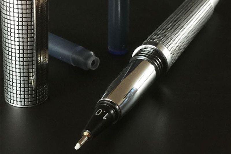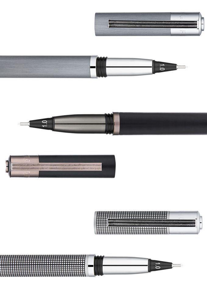本体サイズは130mmで、細かな格子柄がモダンな印象の「ブラックグリッド」、つや消しでシンプルに仕上げた「グレー」、ブラックガンのパーツがクールな「マットブラック」の3種のデザインを用意。特製本革ケース付属で、メタルペンとしての雰囲気もたっぷり。高級感ある佇まいは、高級万年筆やボールペンと一緒にペン皿に並べても見劣りしないカッコよさです。