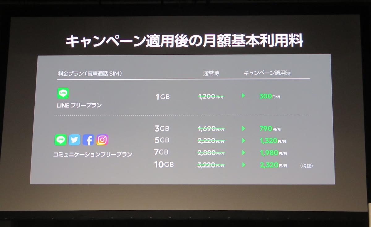 ソフトバンク回線サービスの導入に伴い、お得なキャンペーンも実施されます。まずは「スマホ代 月300円キャンペーン」。ソフトバンク回線・ドコモ回線を問わず、音声通話SIMを契約し、8月31日までに利用を開始した人が対象で、月額基本料が900円×6か月間割引になります。1GBの「LINEフリープラン」の場合、通常1200円から900円が割引されて月額300円になるわけです。