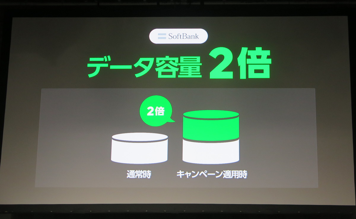 ▲「データ容量2倍キャンペーン」は、現在ドコモ回線プランを利用している人がソフトバンク回線プランに切り替えて場合にも適用