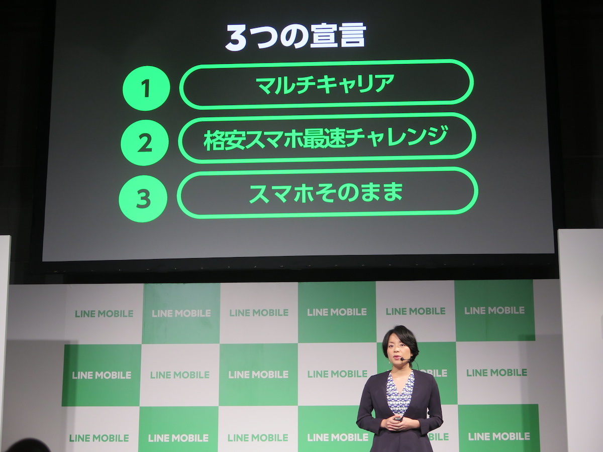 ▲LINEモバイルの新しい施策として「3つの宣言」を発表した嘉戸彩乃社長