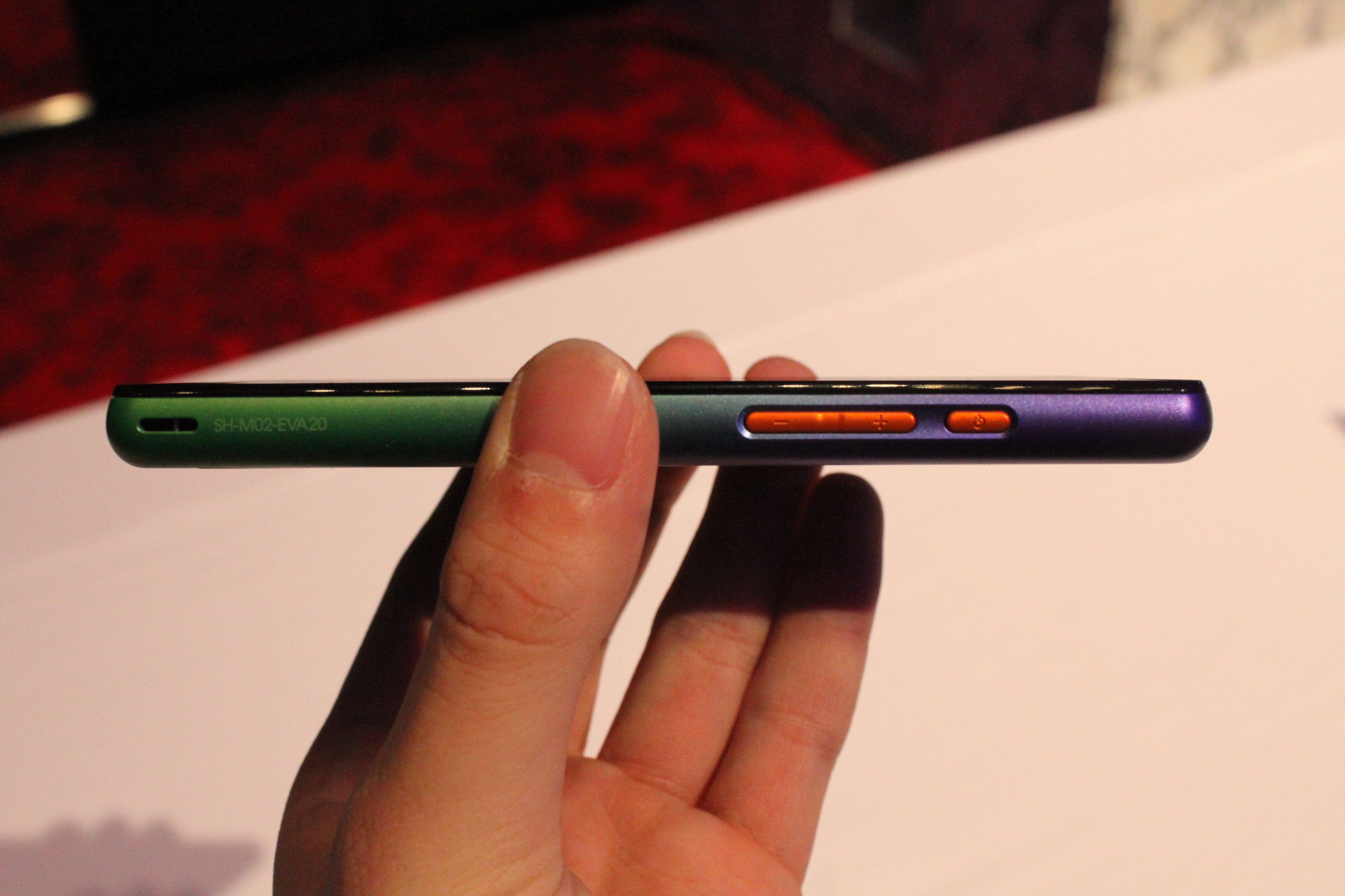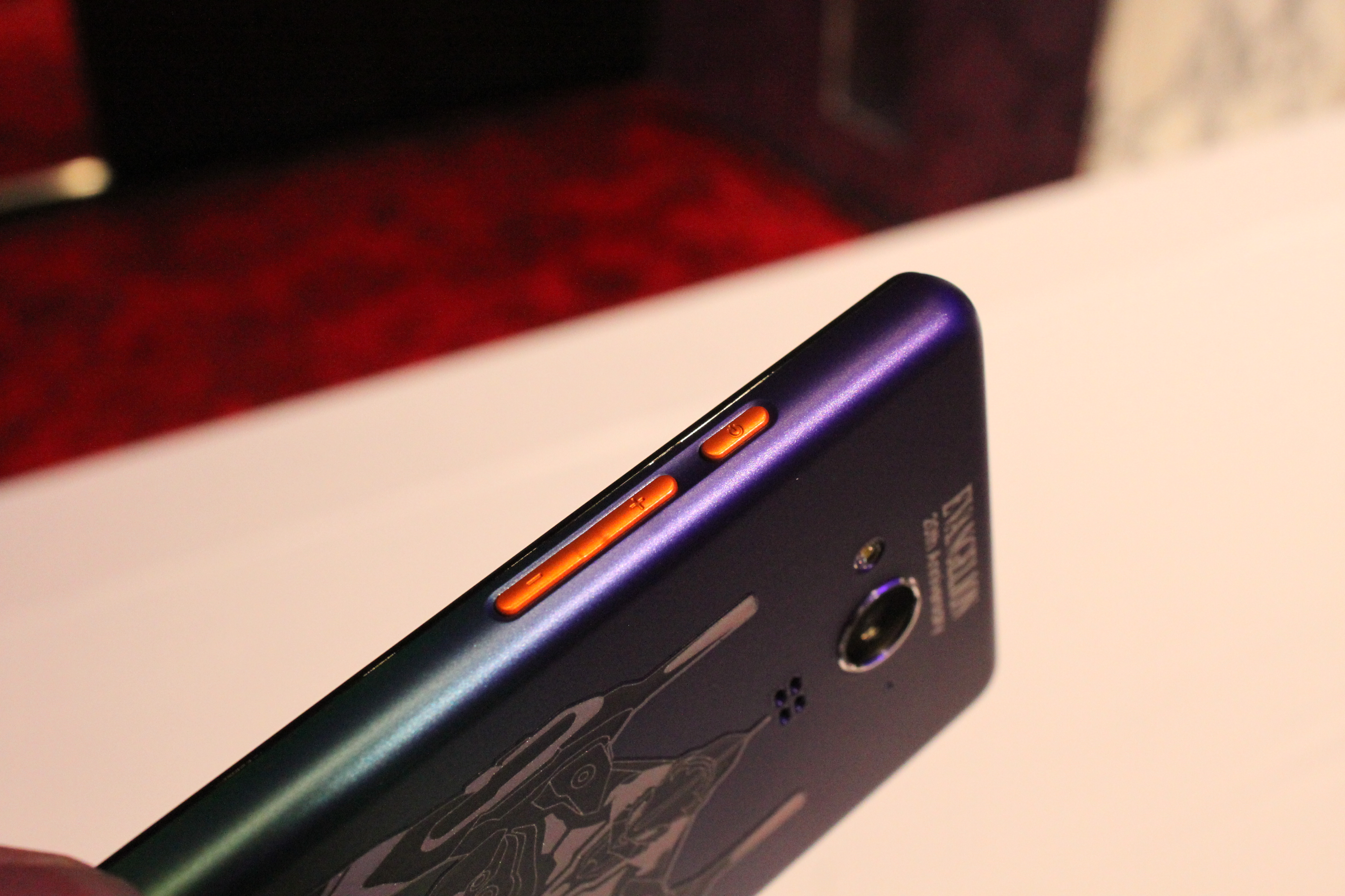 「エヴァンゲリオン 初号機」を想起させるデザインが特徴的です。本体はメタリックなグラデーションカラーで、サイドボタンのみオレンジ色。背面にはホログラムで初号機が描かれています。エヴァンゲリオン20周年を記念するロゴも付いています。また、オリジナルケースも初号機カラーで統一されています。