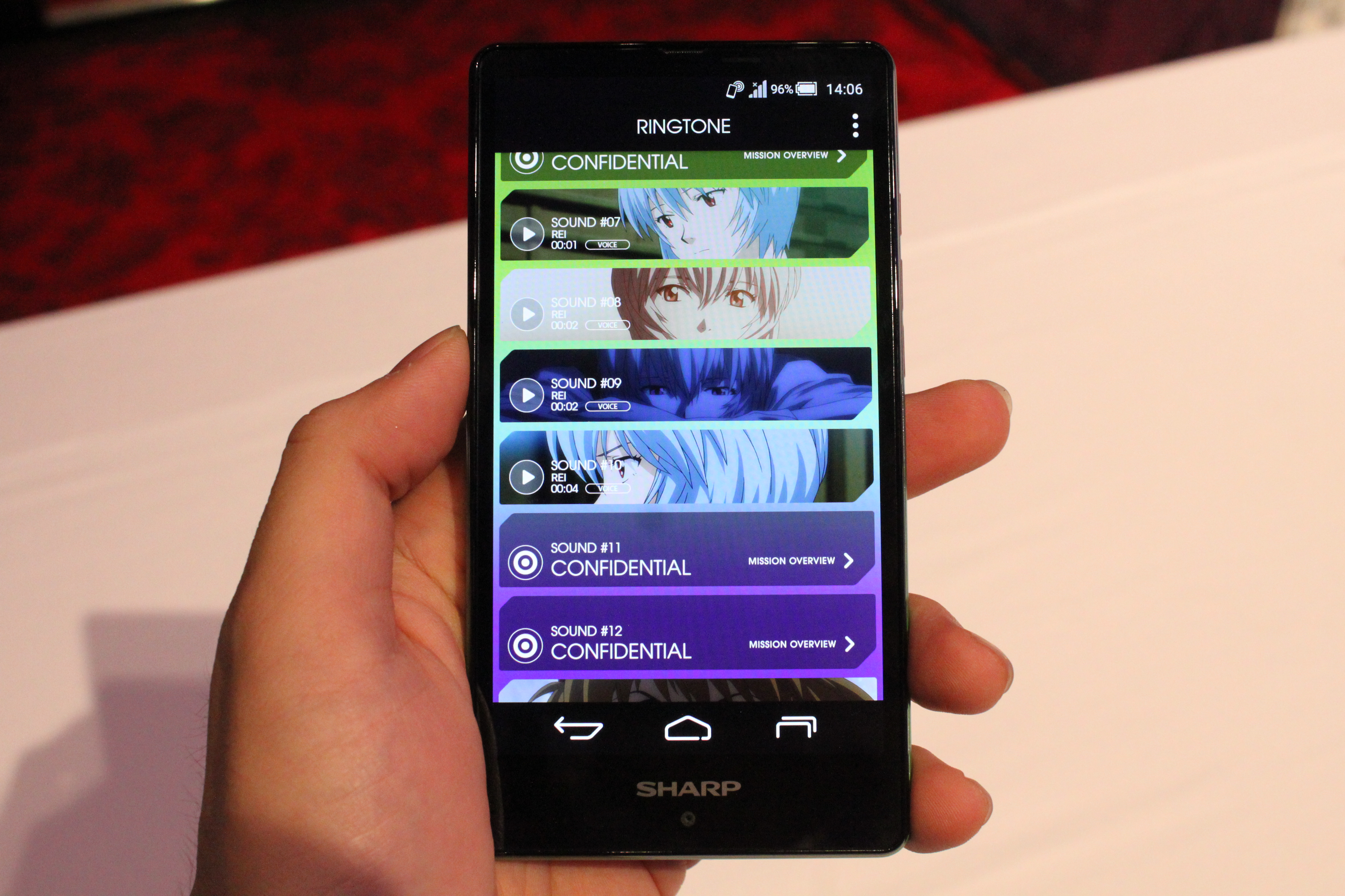 デモンストレーションでは、ミサトさんの声で「時間よ〜おきなさいっ!」、「メールが届いたわよっ、確認して!」、「さ〜て、この次もサービスサービスッ!」というセリフが披露されていました。これらの音声は、もちろん着信音や通知音に設定できます。