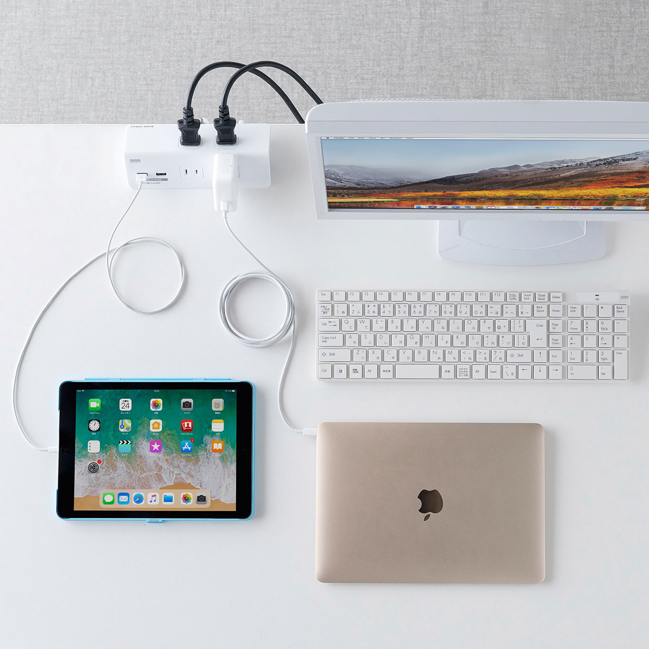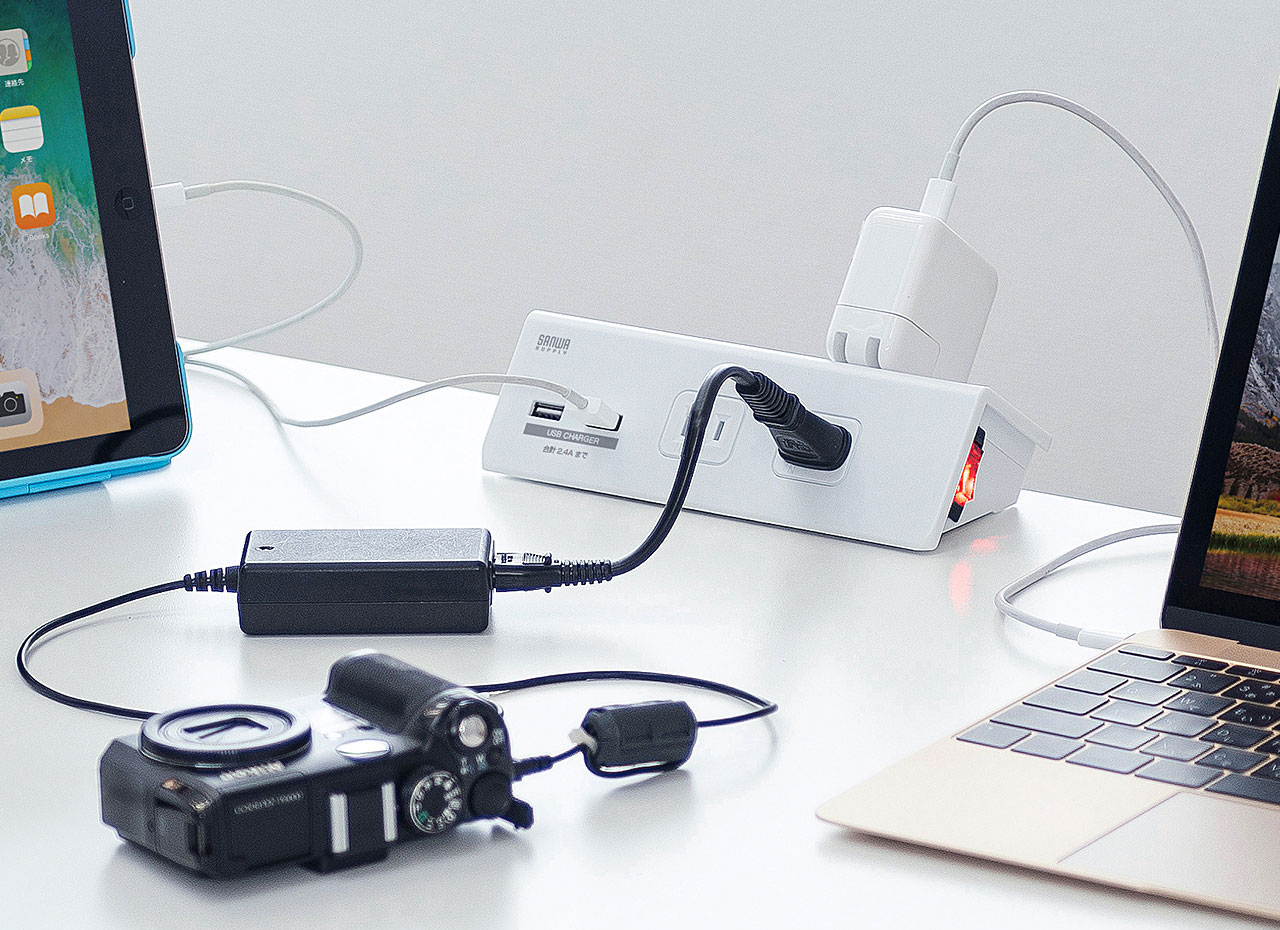 さらに使い勝手にも一工夫あり。電源差込口はタップ正面に2個、 背面に2個配置。スマホやノートPCなど抜き差しが多いものは正面を使用、モニターなど動かさないものは背面を使用というように使い分けができます。また、正面には充電用のUSB Aポートを2個装備しているので、 変換アダプタなしでそのままスマホやタブレットなどのUSB機器の充電ができるのも嬉しいところ!