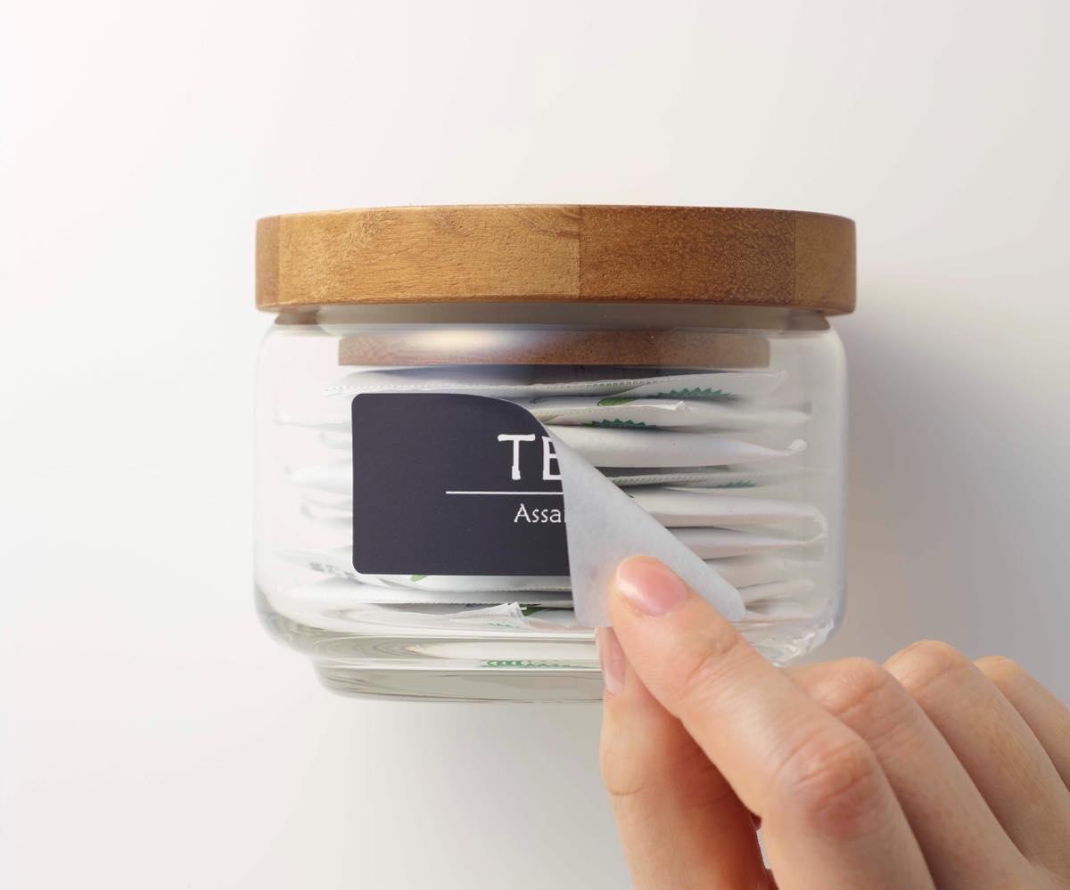 水に強いのでキッチンやランドリーの水回りで使用できるのも嬉しいところ。空き瓶にラベルを貼って調味料やパスタを入れたり、シンプルなボトルに洗剤を詰め替えてラベリングしたりすれば、一気にオシャレな雰囲気に!