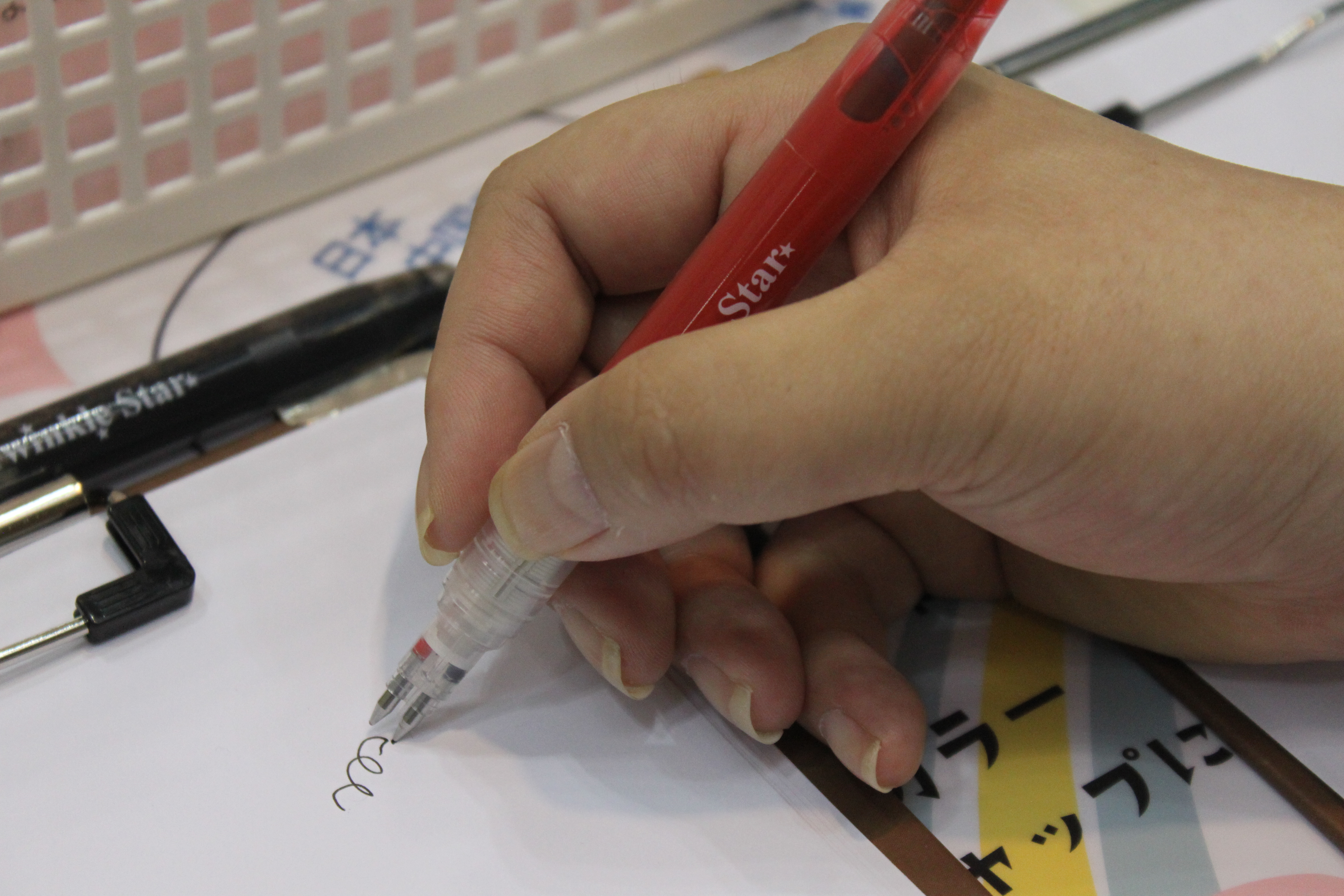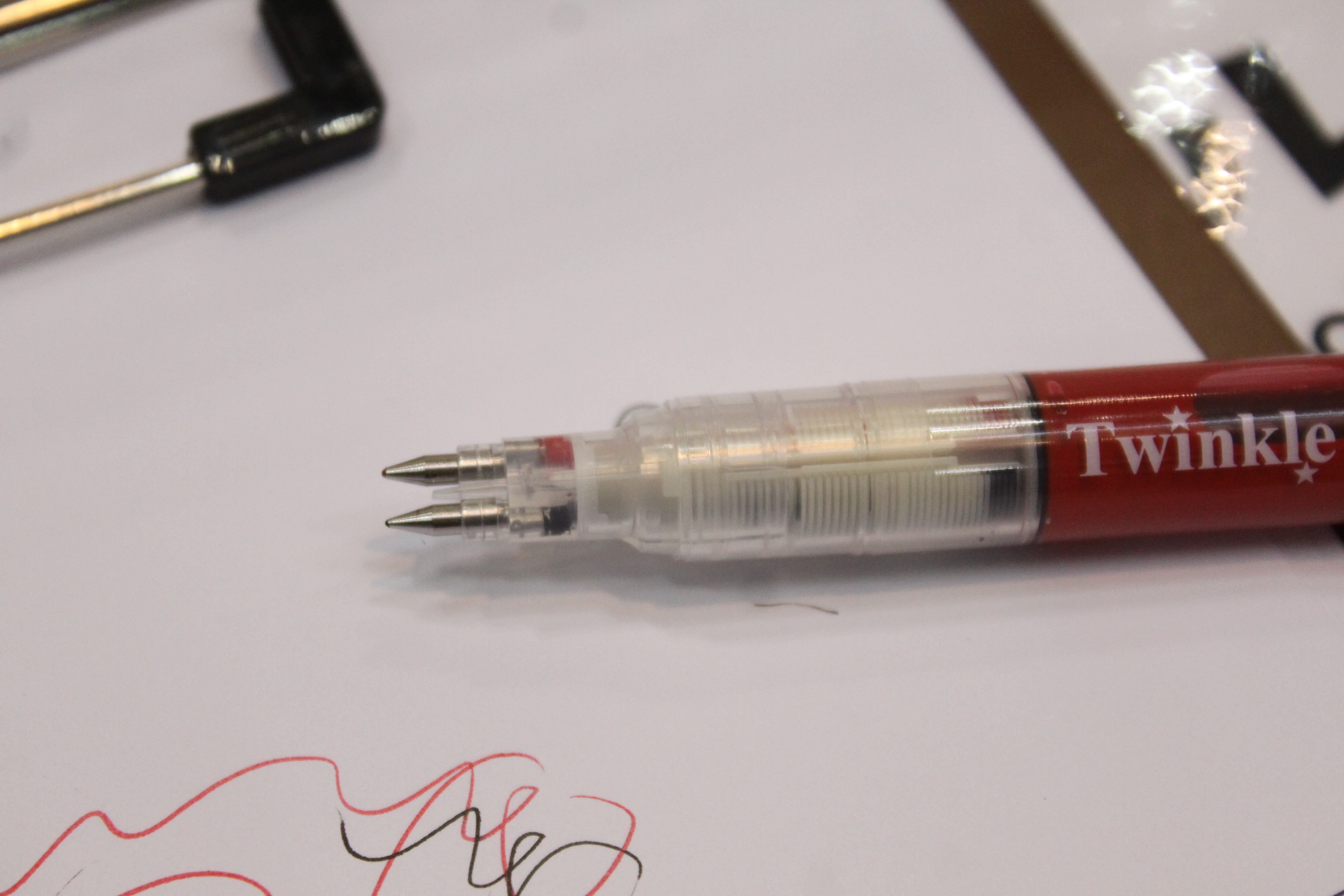 最初に紹介するのは、Vスパークの「2色ボールペン」。名前からは普通のボールペンのように思えますが、いわゆる“2色ボールペン”ではありません。最大の特徴は2色がワンキャップになっていること。キャップを取ると、黒と赤の芯が並んでいます。書きづらそうに見えますが、試し書きすると、2色同時に書いてしまったり、どちらかの芯がもう一方の芯に干渉したりすることもありませんでした。2色とも水性インクを使用しており、書き心地もなめらかです。