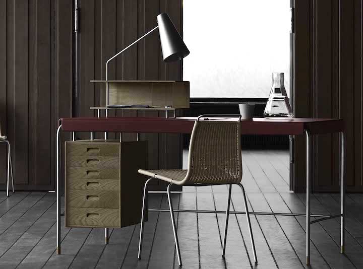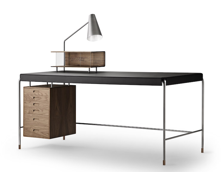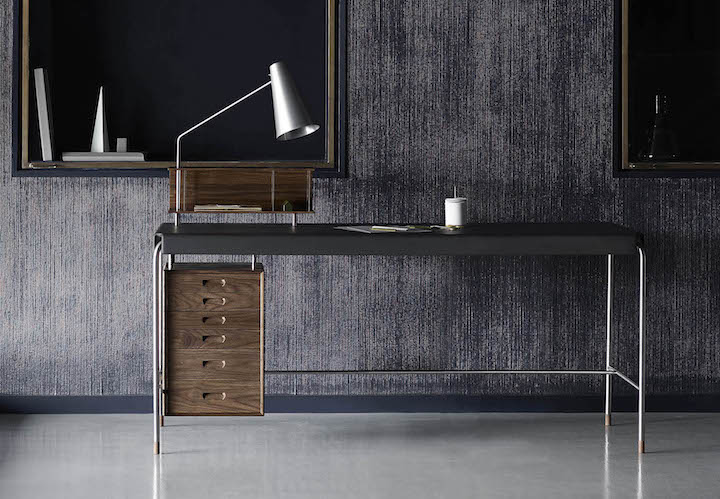 サイズはW140×D70×H72cm(68万5000円〜/税別)とW160×D70×H72cm(71万5000円〜/税別)のふたつがあり、6段の引き出しからなる吊り下げ式の引き出しユニットは、無垢のオーク材、ウォルナット材、ブラック塗装オーク材から選べ、天板の左右どちらか一方に装着されます。また棚と一体型のランプ(20万円〜/税別)はオプション別売りで用意されています。