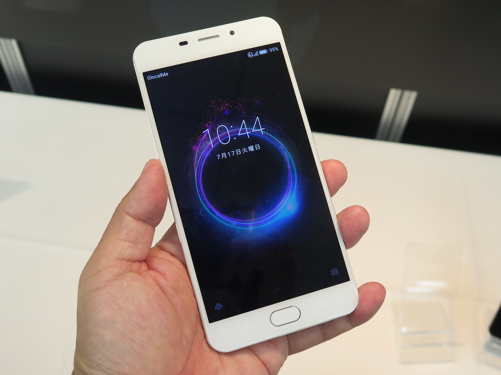 ▲サイズはH154×W76×D7.9mmで、重さは約180g。ディスプレイの下に指紋センサーを搭載。クラウドSIMで日本の通信事業者にも接続可能