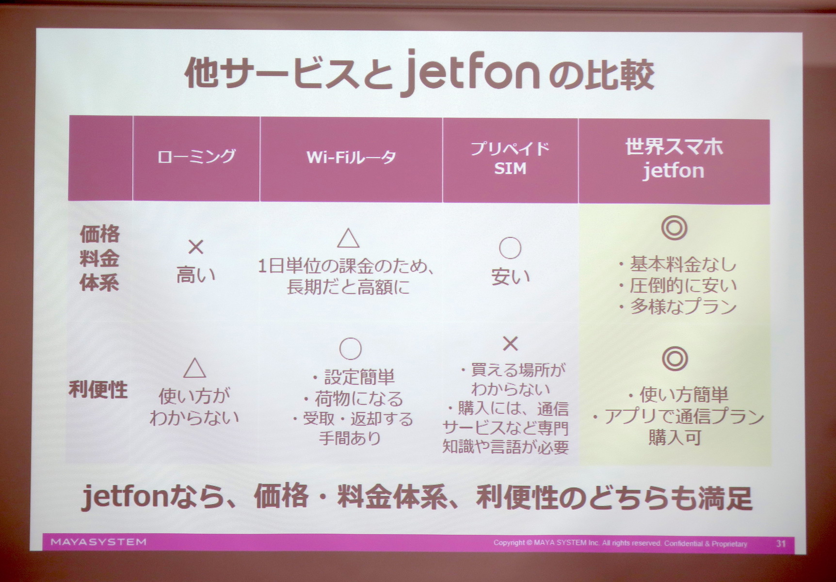 ▲大手キャリアのデータローミングサービスやモバイルWi-Fiルーターのレンタルサービスと比べた優位性をアピール